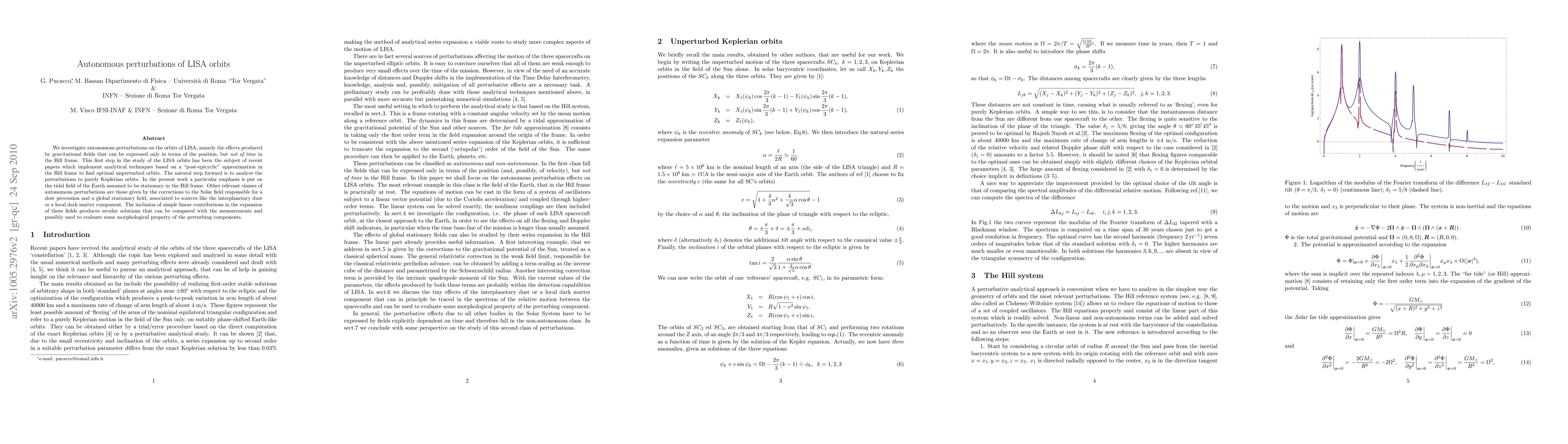 We investigate autonomous perturbations on the orbits of LISA, namely the effects produced by fields that can be expressed only in terms of the position, but not of time in the Hill frame. This first step in the study of the LISA orbits has been the subject of recent papers which implement analytical techniques based on a "post-epicyclic" approximation in the Hill frame to find optimal unperturbed orbits. The natural step forward is to analyze the perturbations to purely Keplerian orbits. In the present work a particular emphasis is put on the tidal field of the Earth assumed to be stationary in the Hill frame. An accurate interpretation of the global structure of the perturbed solution sheds light on possible implications on injection in orbit when the time base-line of the mission is longer than that assumed in previous papers. Other relevant classes of autonomous perturbations are those given by the corrections to the Solar field responsible for a slow precession and a global stationary field, associated to sources like the interplanetary dust or a local dark matter component. The inclusion of simple linear contributions in the expansion of these fields produces secular solutions that can be compared with the measurements and possibly used to evaluate some morphological property of the perturbing components.