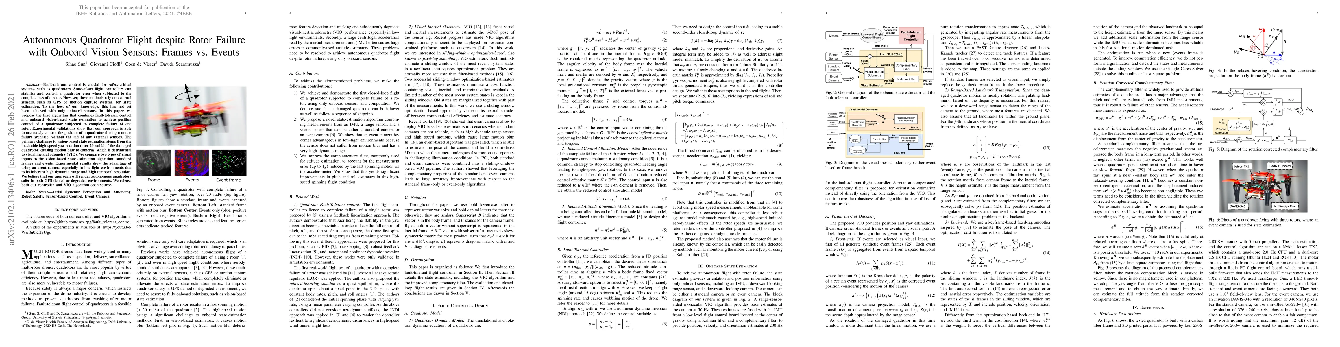 Fault-tolerant control is crucial for safety-critical systems, such as quadrotors. State-of-art flight controllers can stabilize and control a quadrotor even when subjected to the complete loss of a rotor. However, these methods rely on external sensors, such as GPS or motion capture systems, for state estimation. To the best of our knowledge, this has not yet been achieved with only onboard sensors. In this paper, we propose the first algorithm that combines fault-tolerant control and onboard vision-based state estimation to achieve position control of a quadrotor subjected to complete failure of one rotor. Experimental validations show that our approach is able to accurately control the position of a quadrotor during a motor failure scenario, without the aid of any external sensors. The primary challenge to vision-based state estimation stems from the inevitable high-speed yaw rotation (over 20 rad/s) of the damaged quadrotor, causing motion blur to cameras, which is detrimental to visual inertial odometry (VIO). We compare two types of visual inputs to the vision-based state estimation algorithm: standard frames and events. Experimental results show the advantage of using an event camera especially in low light environments due to its inherent high dynamic range and high temporal resolution. We believe that our approach will render autonomous quadrotors safer in both GPS denied or degraded environments. We release both our controller and VIO algorithm open source.