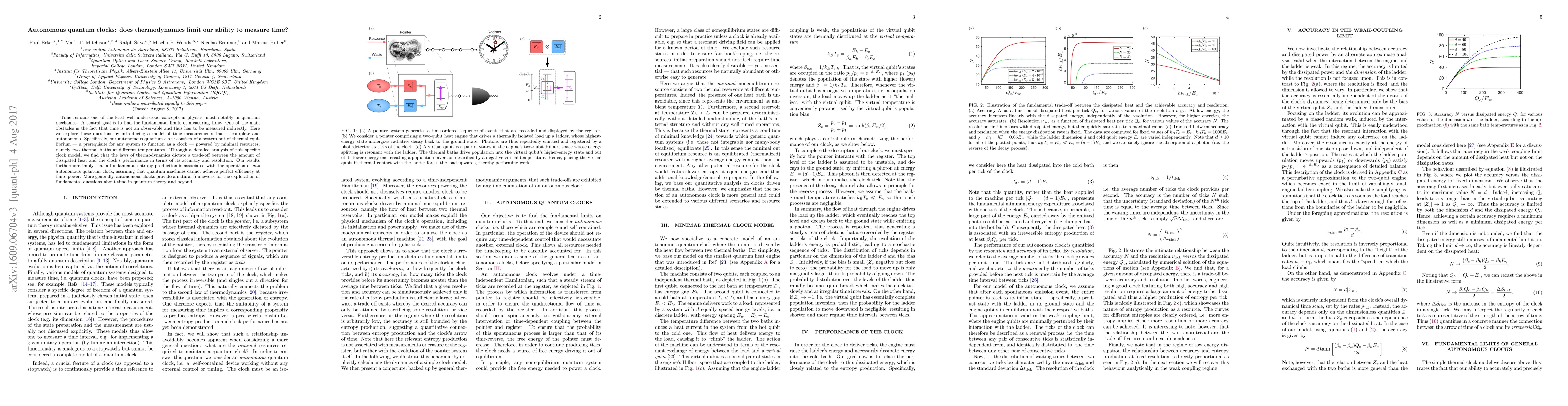 This paper investigates the fundamental limits of autonomous quantum clocks, revealing that thermodynamic principles impose a trade-off between dissipated heat and measurement precision, suggesting inherent entropy production in their operation. The findings suggest a deeper exploration of time measurement in quantum mechanics through this quantum clock model.