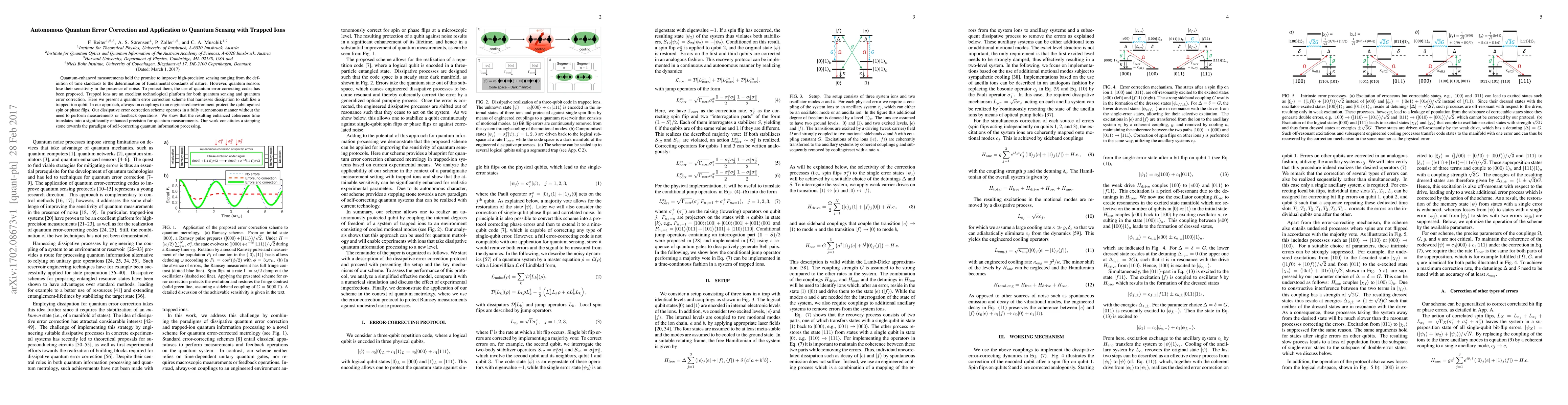 This paper proposes a fully autonomous quantum error correction scheme using trapped ions to stabilize qubits against noise, enhancing the precision of quantum sensing. The method leverages always-on couplings to an engineered environment for error correction without requiring measurements or feedback, paving the way for self-correcting quantum information processing.