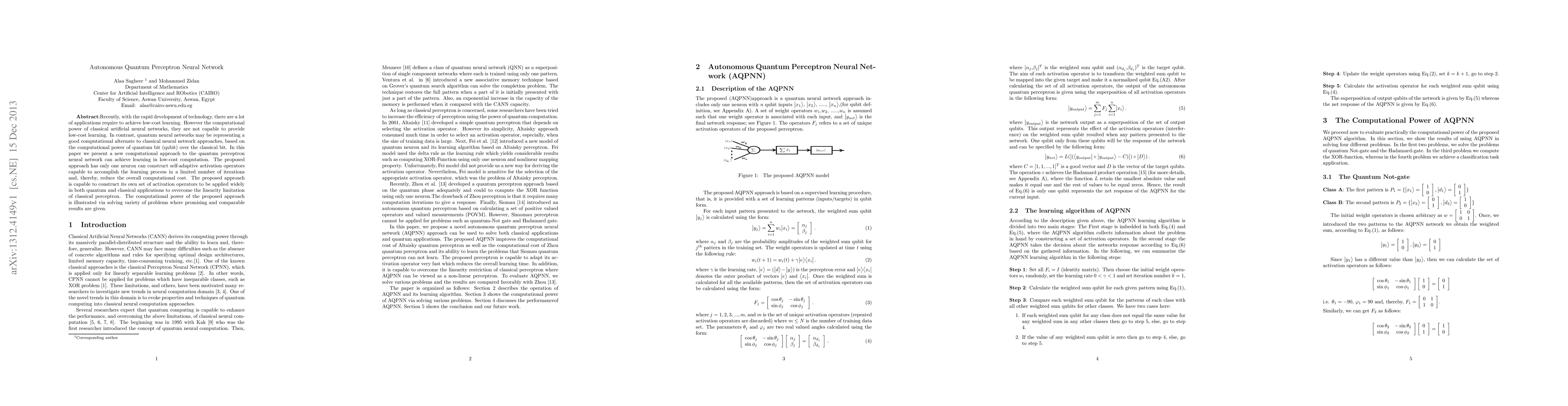 This paper introduces an autonomous quantum perceptron neural network that leverages the computational power of quantum bits to achieve low-cost learning. The proposed approach uses a single neuron to construct self-adaptive activation operators, reducing computational costs and overcoming the linearity limitation of classical perceptrons.