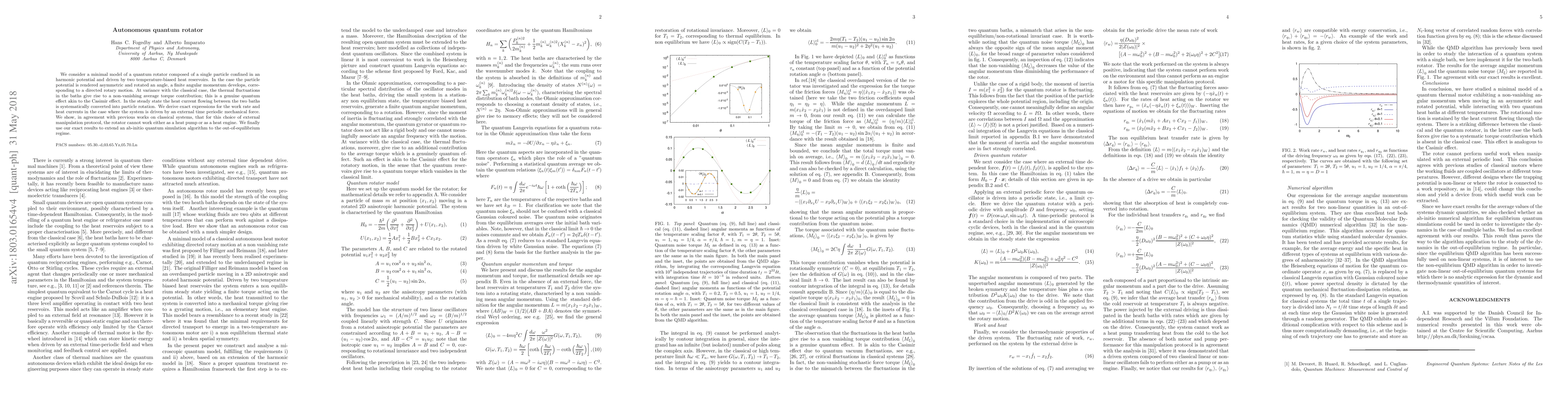 We consider a minimal model of a quantum rotator composed of a single particle confined in an harmonic potential and driven by two temperature-biased heat reservoirs. In the case the particle potential is rendered asymmetric and rotated an angle, a finite angular momentum develops, corresponding to a directed rotary motion. At variance with the classical case, the thermal fluctuations in the baths give rise to a non-vanishing average torque contribution; this is a genuine quantum effect akin to the Casimir effect. In the steady state the heat current flowing between the two baths is systematically converted into particle rotation. We derive exact expressions for the work rate and heat currents in the case where the system is driven by an external time periodic mechanical force. We show, in agreement with previous works on classical systems, that for this choice of external manipulation protocol, the rotator cannot work either as a heat pump or as a heat engine. We finally use our exact results to extend an ab-initio quantum simulation algorithm to the out-of-equilibrium regime.