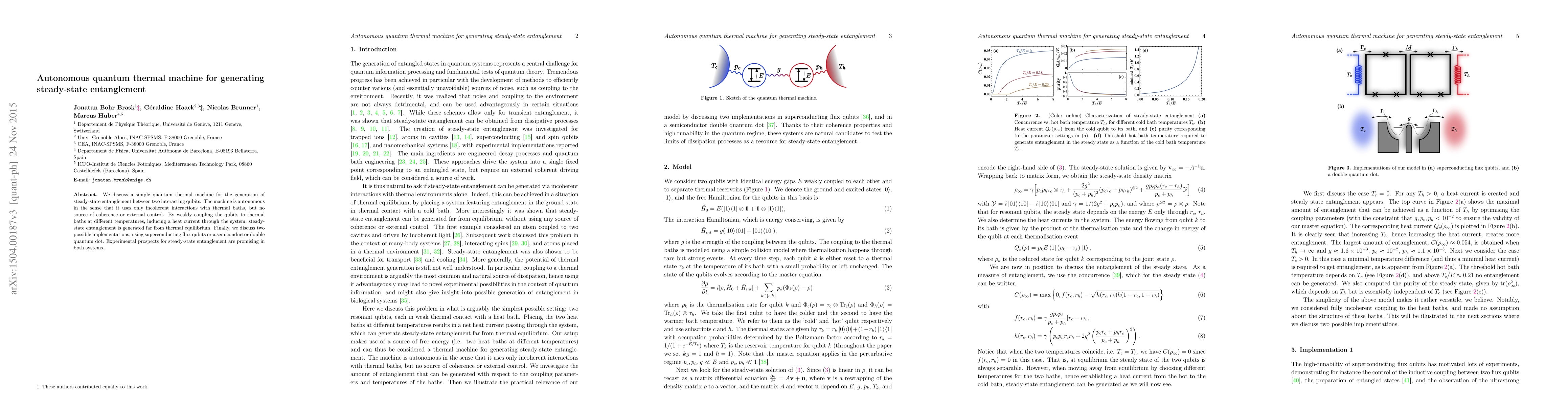 We discuss a simple quantum thermal machine for the generation of steady-state entanglement between two interacting qubits. The machine is autonomous in the sense that it uses only incoherent interactions with thermal baths, but no source of coherence or external control. By weakly coupling the qubits to thermal baths at different temperatures, inducing a heat current through the system, steady-state entanglement is generated far from thermal equilibrium. Finally, we discuss two possible implementations, using superconducting flux qubits or a semiconductor double quantum dot. Experimental prospects for steady-state entanglement are promising in both systems.