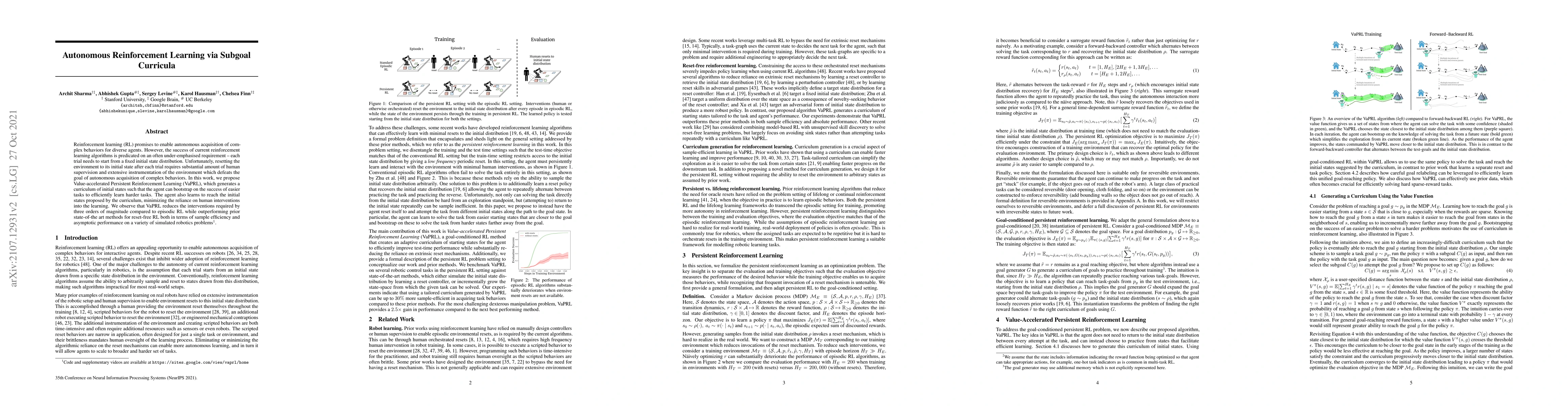 Reinforcement learning (RL) promises to enable autonomous acquisition of complex behaviors for diverse agents. However, the success of current reinforcement learning algorithms is predicated on an often under-emphasised requirement -- each trial needs to start from a fixed initial state distribution. Unfortunately, resetting the environment to its initial state after each trial requires substantial amount of human supervision and extensive instrumentation of the environment which defeats the goal of autonomous acquisition of complex behaviors. In this work, we propose Value-accelerated Persistent Reinforcement Learning (VaPRL), which generates a curriculum of initial states such that the agent can bootstrap on the success of easier tasks to efficiently learn harder tasks. The agent also learns to reach the initial states proposed by the curriculum, minimizing the reliance on human interventions into the learning. We observe that VaPRL reduces the interventions required by three orders of magnitude compared to episodic RL while outperforming prior state-of-the art methods for reset-free RL both in terms of sample efficiency and asymptotic performance on a variety of simulated robotics problems.