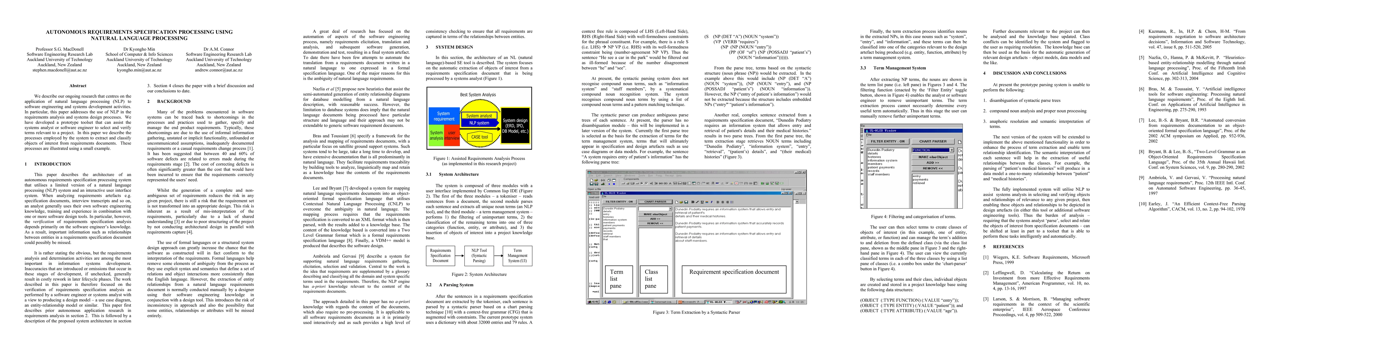 We describe our ongoing research that centres on the application of natural language processing (NLP) to software engineering and systems development activities. In particular, this paper addresses the use of NLP in the requirements analysis and systems design processes. We have developed a prototype toolset that can assist the systems analyst or software engineer to select and verify terms relevant to a project. In this paper we describe the processes employed by the system to extract and classify objects of interest from requirements documents. These processes are illustrated using a small example.
