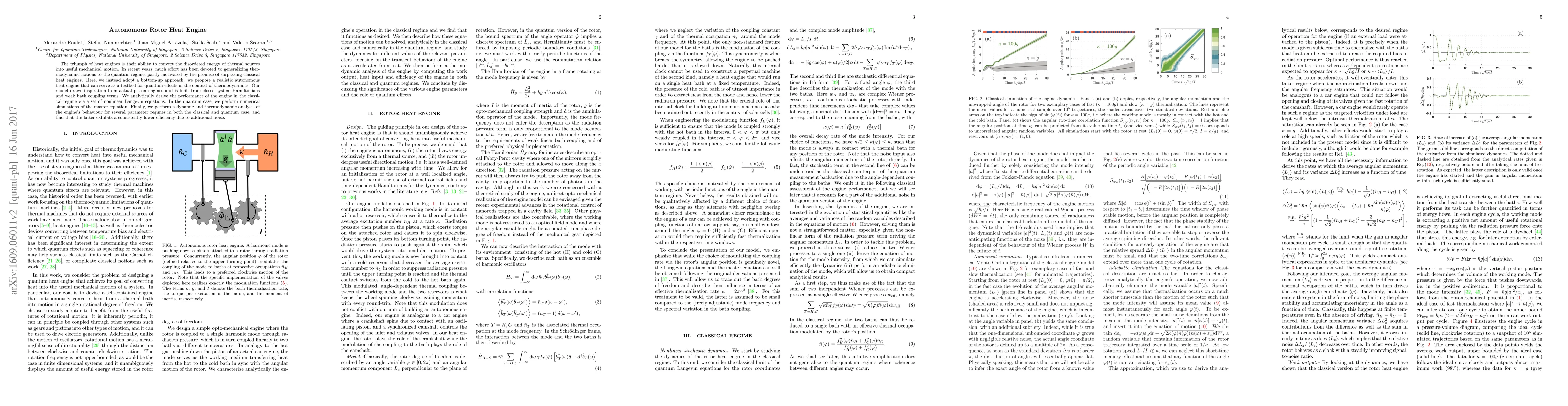 This paper proposes an autonomous rotor heat engine modeled after classical piston engines, utilizing closed-system Hamiltonians and weak bath coupling. It analytically and numerically analyzes the engine's performance in classical and quantum regimes, finding that quantum effects consistently reduce efficiency due to additional noise.