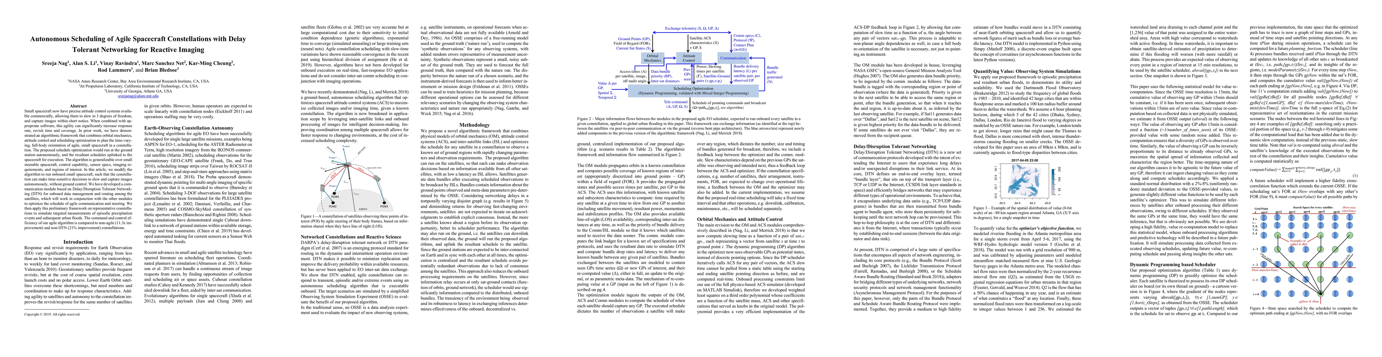Small spacecraft now have precise attitude control systems available commercially, allowing them to slew in 3 degrees of freedom, and capture images within short notice. When combined with appropriate software, this agility can significantly increase response rate, revisit time and coverage. In prior work, we have demonstrated an algorithmic framework that combines orbital mechanics, attitude control and scheduling optimization to plan the time-varying, full-body orientation of agile, small spacecraft in a constellation. The proposed schedule optimization would run at the ground station autonomously, and the resultant schedules uplinked to the spacecraft for execution. The algorithm is generalizable over small steerable spacecraft, control capability, sensor specs, imaging requirements, and regions of interest. In this article, we modify the algorithm to run onboard small spacecraft, such that the constellation can make time-sensitive decisions to slew and capture images autonomously, without ground control. We have developed a communication module based on Delay/Disruption Tolerant Networking (DTN) for onboard data management and routing among the satellites, which will work in conjunction with the other modules to optimize the schedule of agile communication and steering. We then apply this preliminary framework on representative constellations to simulate targeted measurements of episodic precipitation events and subsequent urban floods. The command and control efficiency of our agile algorithm is compared to non-agile (11.3x improvement) and non-DTN (21% improvement) constellations.