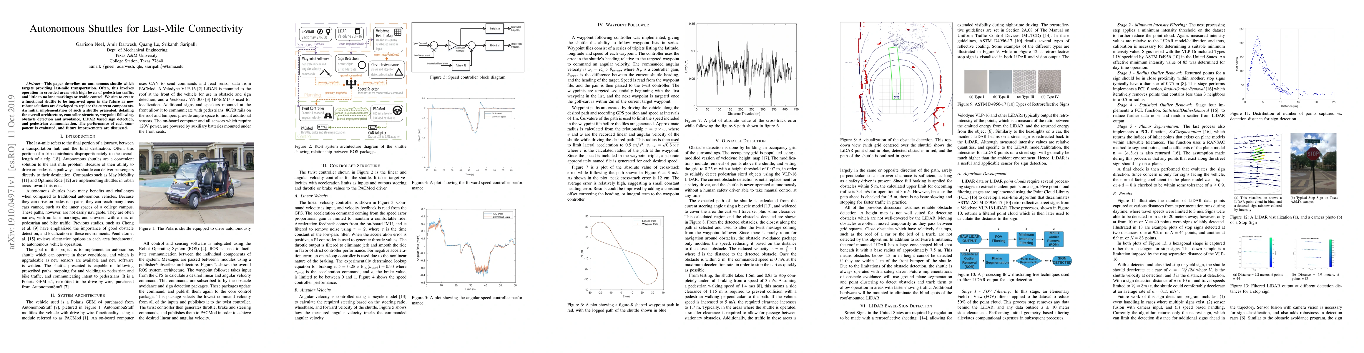 This paper describes an autonomous shuttle which targets providing last-mile transportation. Often, this involves operation in crowded areas with high levels of pedestrian traffic, and little to no lane markings or traffic control. We aim to create a functional shuttle to be improved upon in the future as new robust solutions are developed to replace the current components. An initial implementation of such a shuttle presented, detailing the overall architecture, controller structure, waypoint following, obstacle detection and avoidance, LiDAR based sign detection, and pedestrian communication. The performance of each component is evaluated, and future improvements are discussed.