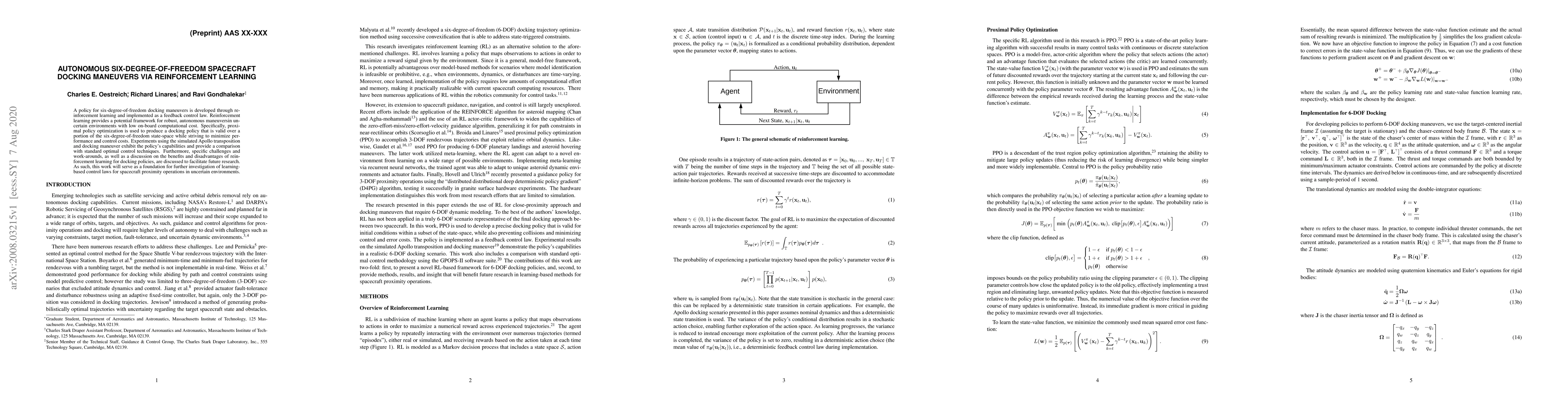 This paper develops a reinforcement learning-based policy for autonomous six-degree-of-freedom spacecraft docking maneuvers, utilizing proximal policy optimization to minimize performance and control costs. Experiments demonstrate its effectiveness compared to standard control techniques, highlighting the potential and challenges of reinforcement learning for spacecraft docking.