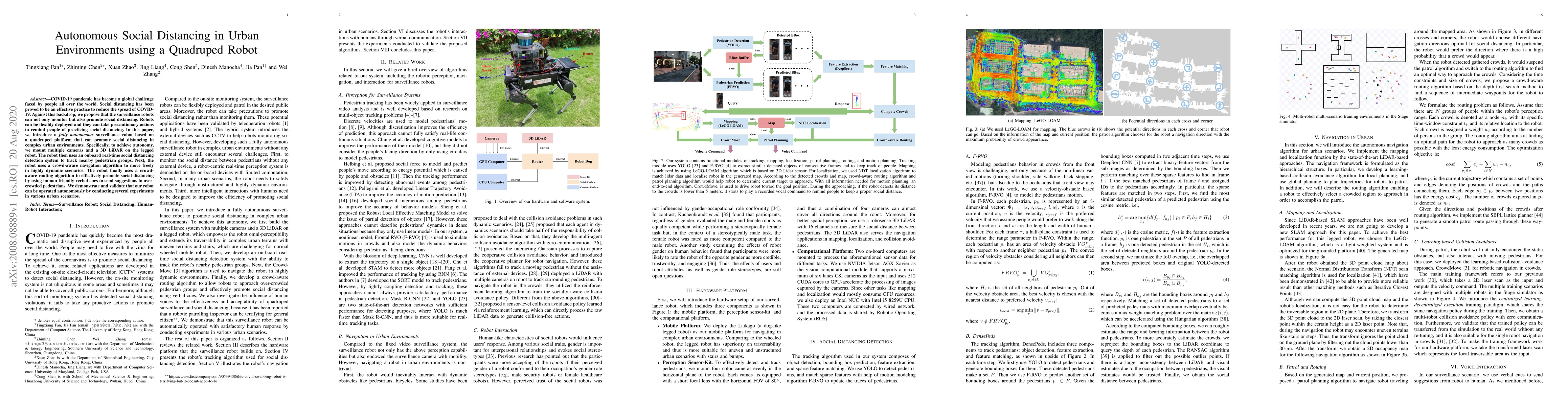 This paper proposes an autonomous quadruped robot equipped with sensors to monitor and promote social distancing in urban environments. The robot uses real-time detection and crowd-aware navigation to suggest social distancing to pedestrians through verbal cues, demonstrating effective operation in various urban scenarios.