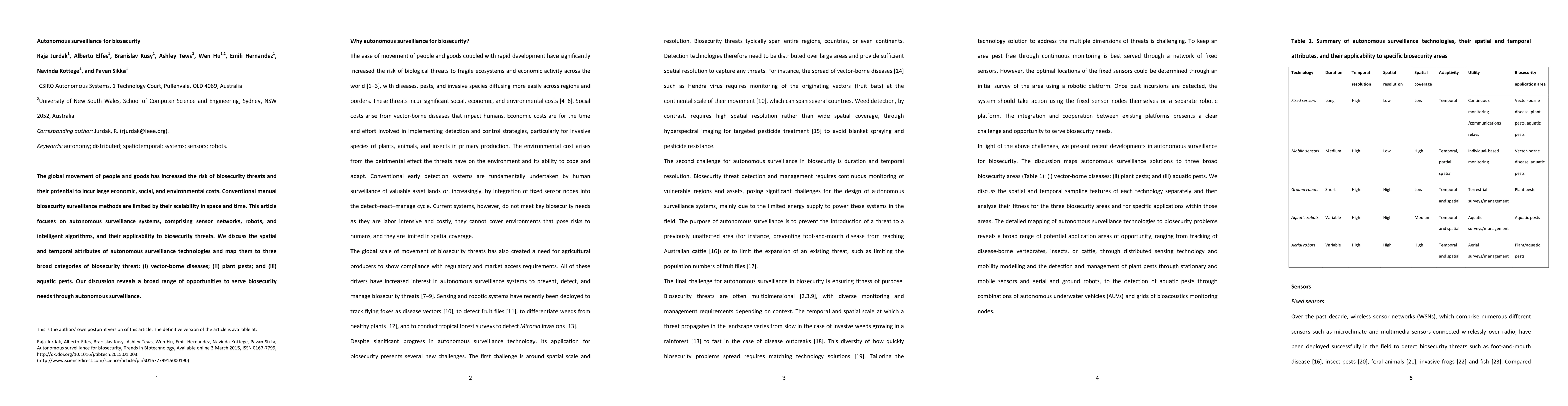 The global movement of people and goods has increased the risk of biosecurity threats and their potential to incur large economic, social, and environmental costs. Conventional manual biosecurity surveillance methods are limited by their scalability in space and time. This article focuses on autonomous surveillance systems, comprising sensor networks, robots, and intelligent algorithms, and their applicability to biosecurity threats. We discuss the spatial and temporal attributes of autonomous surveillance technologies and map them to three broad categories of biosecurity threat: (i) vector-borne diseases; (ii) plant pests; and (iii) aquatic pests. Our discussion reveals a broad range of opportunities to serve biosecurity needs through autonomous surveillance.