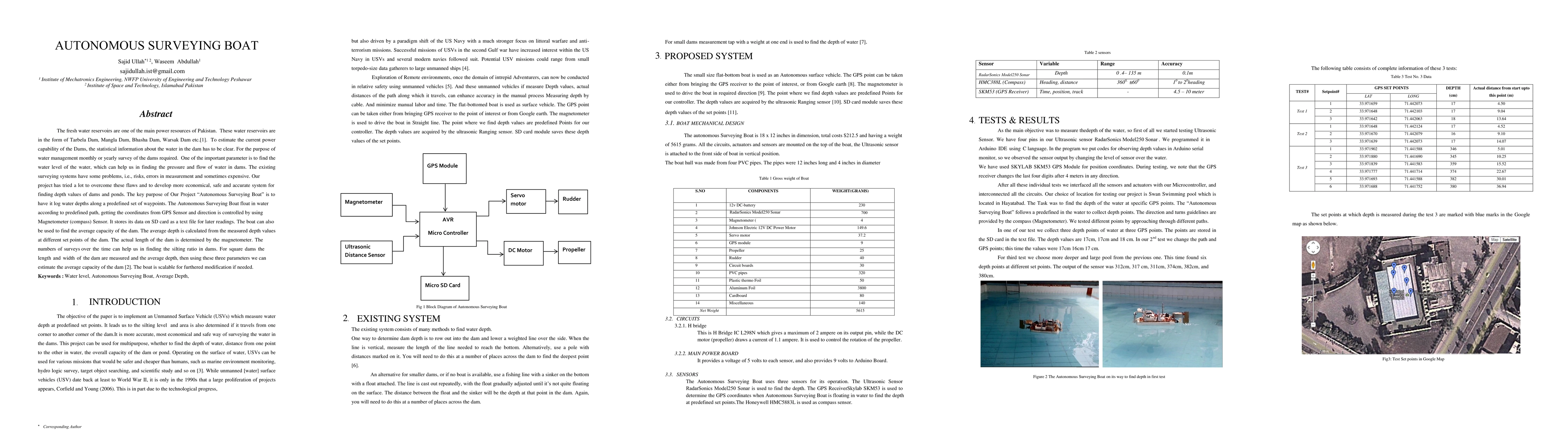The fresh water reservoirs are one of the main power resources of Pakistan.These water reservoirs are in the form of Tarbela Dam, Mangla Dam, Bhasha Dam,and Warsak Dam. To estimate the current power capability of the Dams, the statistical information about the water in the dam has to be clear and precise. For the purpose of water management monthly or yearly survey of the dams required. One of the important parameter is to find the water level of water, which can help us in finding the pressure and flow of water in dams. The existing surveying systems have some problems, i.e., risky, errors in measurement and sometimes expensive. Our project has tried a lot to overcome these flaws and to develop more economical, safe and accurate system for finding depth values of dams and ponds. The key purpose of Our Project Autonomous Surveying Boat is to have it log water depths along a predefined set of points. The Autonomous Surveying Boat floats in water according to predefined path, getting the coordinates from GPS Sensor and direction is controlled by using Magnetometer Sensor. It stores its data on SD card as a text file for later readings. The boat can also be used to find the average capacity of the dam. The average depth is calculated from the measured depth values at different set points of the dam. The actual length of the dam is determined by the magnetometer. The numbers of surveys over the time can help us in finding the silting ratio in dams.For square dams the length and width of the dam are measured and the average depth, then using these three parameters we can estimate the average capacity of the dam.The boat is scalable for furthered modification if needed.
