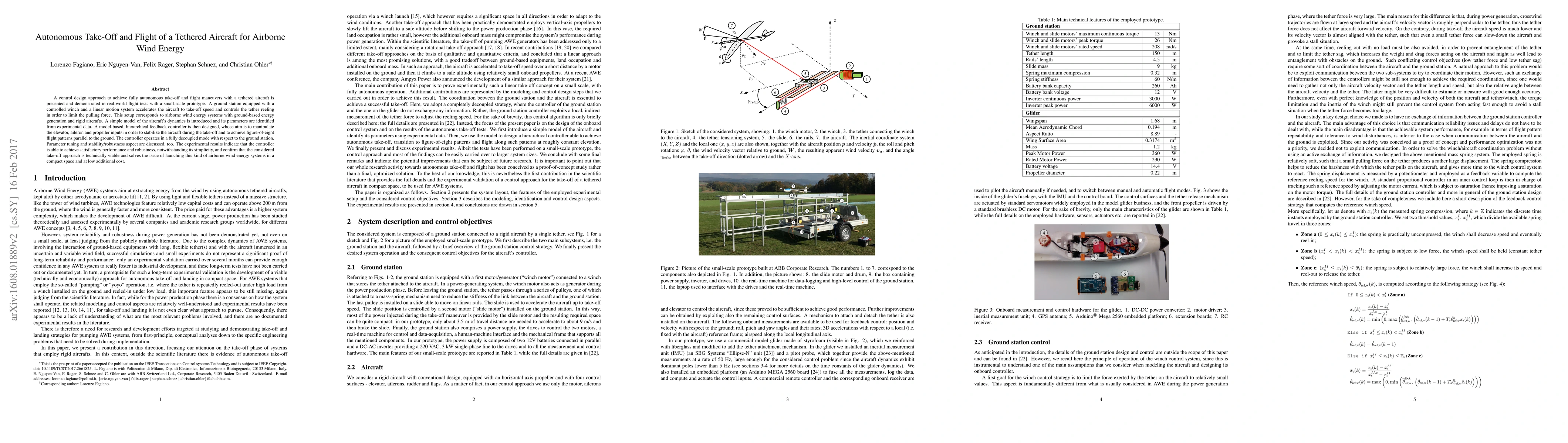 A control design approach to achieve fully autonomous take-off and flight maneuvers with a tethered aircraft is presented and demonstrated in real-world flight tests with a small-scale prototype. A ground station equipped with a controlled winch and a linear motion system accelerates the aircraft to take-off speed and controls the tether reeling in order to limit the pulling force. This setup corresponds to airborne wind energy systems with ground-based energy generation and rigid aircrafts. A simple model of the aircraft's dynamics is introduced and its parameters are identified from experimental data. A model-based, hierarchical feedback controller is then designed, whose aim is to manipulate the elevator, aileron and propeller inputs in order to stabilize the aircraft during the take-off and to achieve figure-of-eight flight patterns parallel to the ground. The controller operates in a fully decoupled mode with respect to the ground station. Parameter tuning and stability/robustness aspect are discussed, too. The experimental results indicate that the controller is able to achieve satisfactory performance and robustness, notwithstanding its simplicity, and confirm that the considered take-off approach is technically viable and solves the issue of launching this kind of airborne wind energy systems in a compact space and at low additional cost.