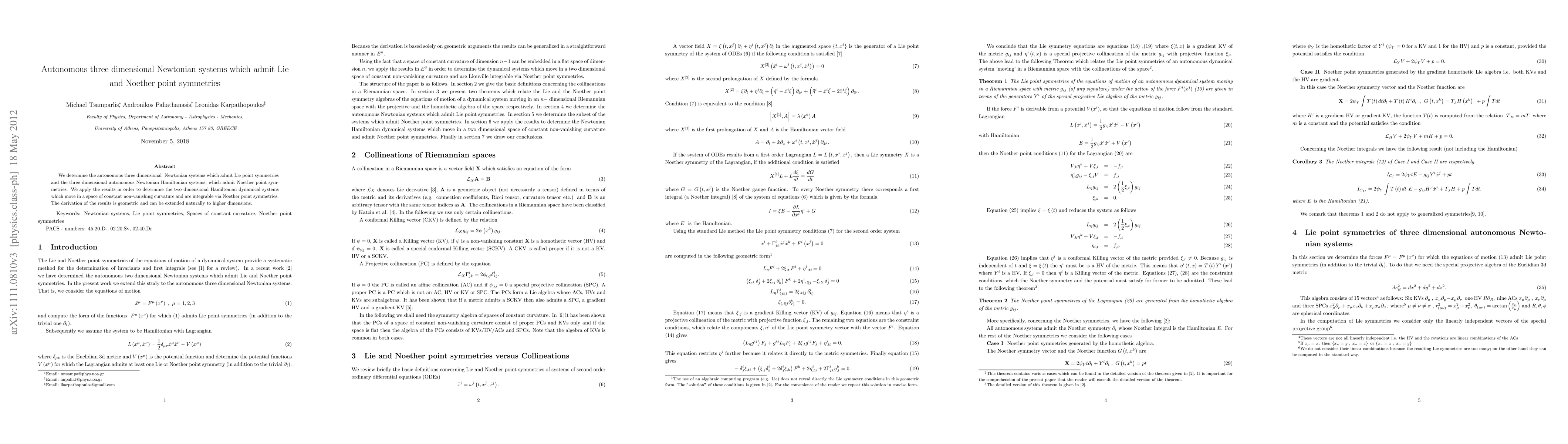 This paper identifies autonomous three-dimensional Newtonian systems with Lie point symmetries and Hamiltonian systems with Noether point symmetries. It applies these findings to determine integrable two-dimensional Hamiltonian dynamical systems in spaces with constant non-vanishing curvature.