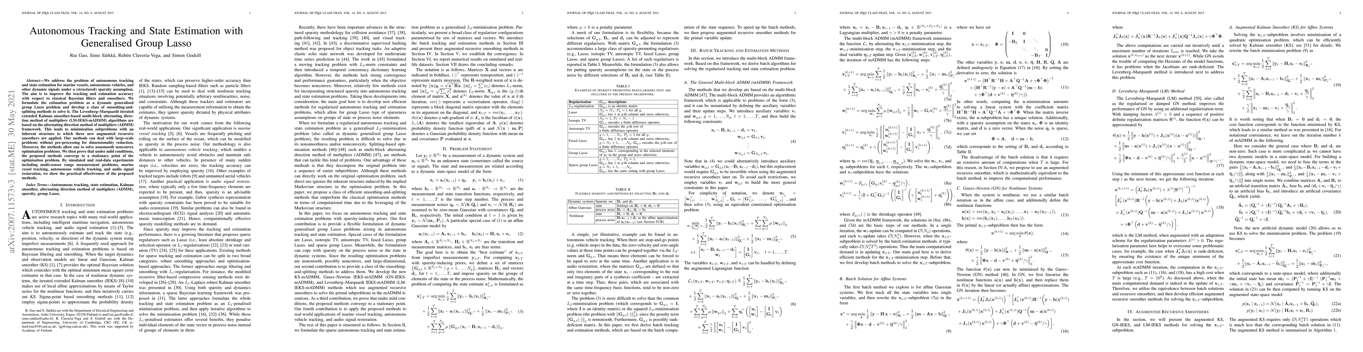We address the problem of autonomous tracking and state estimation for marine vessels, autonomous vehicles, and other dynamic signals under a (structured) sparsity assumption. The aim is to improve the tracking and estimation accuracy with respect to classical Bayesian filters and smoothers. We formulate the estimation problem as a dynamic generalised group Lasso problem and develop a class of smoothing-and-splitting methods to solve it. The Levenberg--Marquardt iterated extended Kalman smoother-based multi-block alternating direction method of multipliers (LM-IEKS-mADMM) algorithms are based on the alternating direction method of multipliers (ADMM) framework. This leads to minimisation subproblems with an inherent structure to which three new augmented recursive smoothers are applied. Our methods can deal with large-scale problems without pre-processing for dimensionality reduction. Moreover, the methods allow one to solve nonsmooth nonconvex optimisation problems. We then prove that under mild conditions, the proposed methods converge to a stationary point of the optimisation problem. By simulated and real-data experiments including multi-sensor range measurement problems, marine vessel tracking, autonomous vehicle tracking, and audio signal restoration, we show the practical effectiveness of the proposed methods.