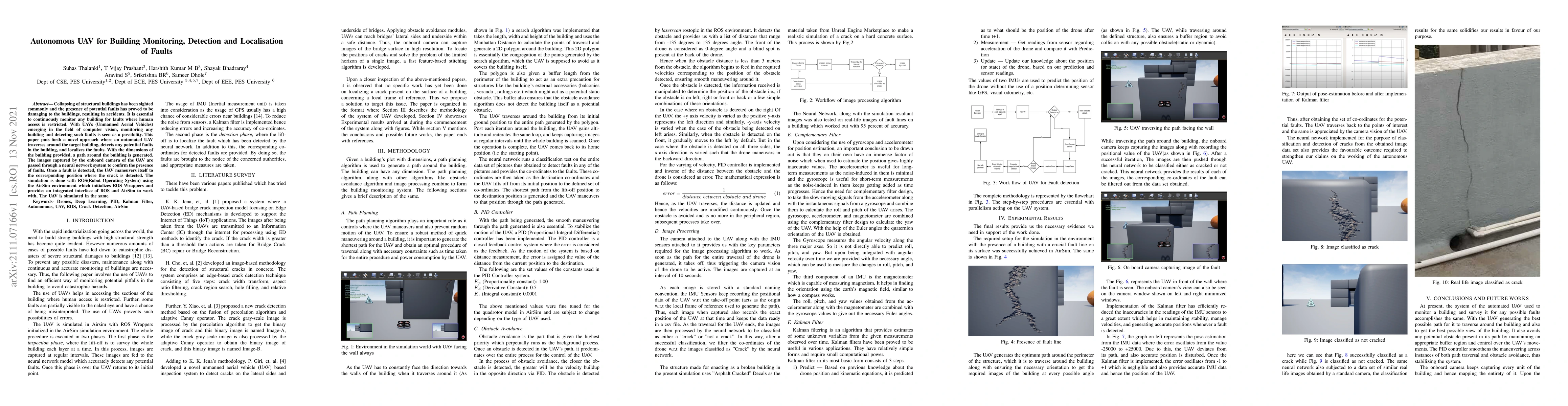Collapsing of structural buildings has been sighted commonly and the presence of potential faults has proved to be damaging to the buildings, resulting in accidents. It is essential to continuously monitor any building for faults where human access is restricted. With UAVs (Unmanned Aerial Vehicles) emerging in the field of computer vision, monitoring any building and detecting such faults is seen as a possibility. This paper puts forth a novel approach where an automated UAV traverses around the target building, detects any potential faults in the building, and localizes the faults. With the dimensions of the building provided, a path around the building is generated. The images captured by the onboard camera of the UAV are passed through a neural network system to confirm the presence of faults. Once a fault is detected, the UAV maneuvers itself to the corresponding position where the crack is detected. The simulation is done with ROS(Robot Operating System) using the AirSim environment which initializes ROS Wrappers and provides an integrated interface of ROS and AirSim to work with, The UAV is simulated in the same.