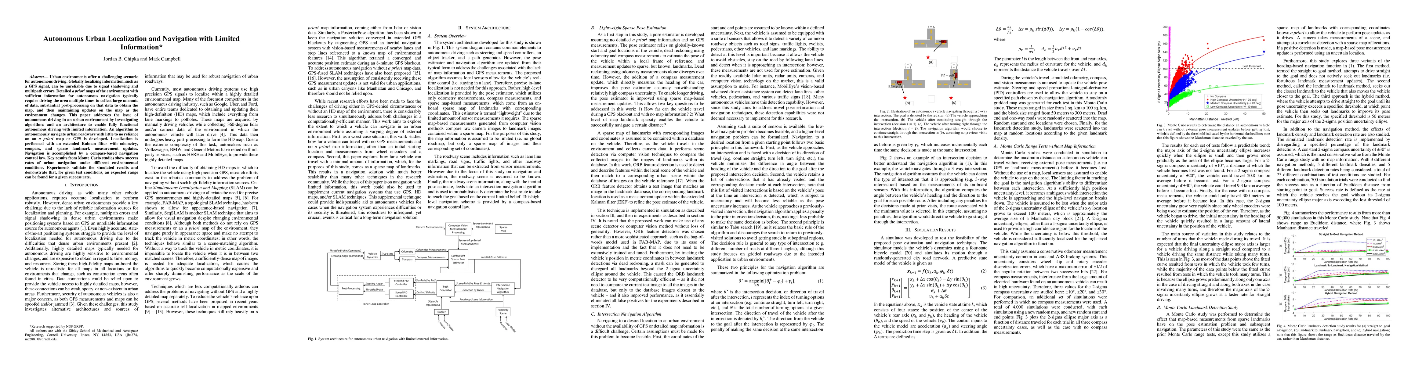 Urban environments offer a challenging scenario for autonomous driving. Globally localizing information, such as a GPS signal, can be unreliable due to signal shadowing and multipath errors. Detailed a priori maps of the environment with sufficient information for autonomous navigation typically require driving the area multiple times to collect large amounts of data, substantial post-processing on that data to obtain the map, and then maintaining updates on the map as the environment changes. This paper addresses the issue of autonomous driving in an urban environment by investigating algorithms and an architecture to enable fully functional autonomous driving with limited information. An algorithm to autonomously navigate urban roadways with little to no reliance on an a priori map or GPS is developed. Localization is performed with an extended Kalman filter with odometry, compass, and sparse landmark measurement updates. Navigation is accomplished by a compass-based navigation control law. Key results from Monte Carlo studies show success rates of urban navigation under different environmental conditions. Experiments validate the simulated results and demonstrate that, for given test conditions, an expected range can be found for a given success rate.