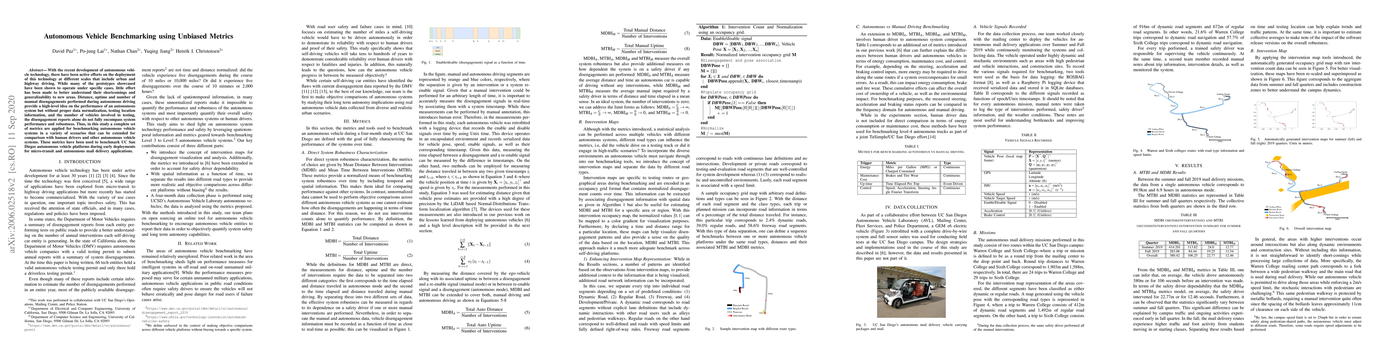 This paper proposes a comprehensive set of unbiased metrics for benchmarking autonomous vehicle systems across various scenarios, including urban and highway driving. The study applies these metrics to evaluate UC San Diego's autonomous vehicle platforms for micro-transit and mail delivery, aiming to better understand system performance and generalizability.