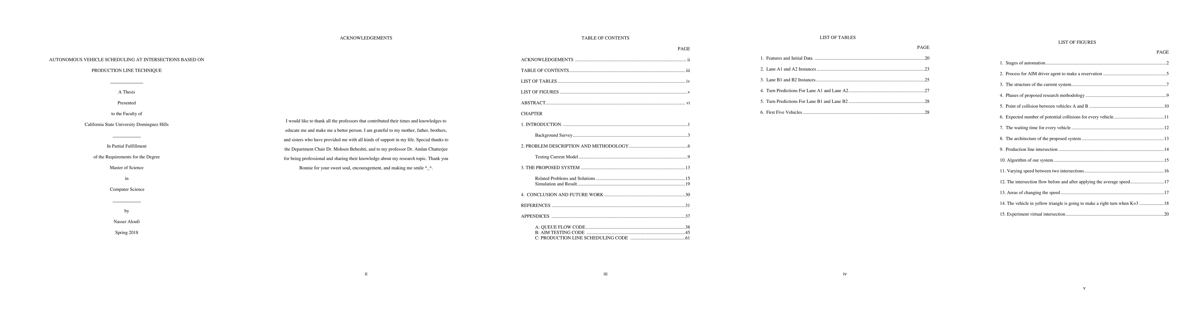 This thesis considers the problem of scheduling autonomous vehicles at intersections. A new system is proposed which is more efficient and could replace the recently introduced Autonomous Intersection Management (AIM) model. The proposed system is based on the production line technique. The environment of the intersection, vehicles position, speeds, and turning are specified and determined in advance. The goal of the proposed system is to eliminate vehicle collision and reduce the waiting time to cross the intersection. Three different patterns of traffic flow towards the intersection have been tested. The system requires less waiting time, compared to the other models, including the random case where the flow is unpredictable. The K-Nearest Neighbors (KNN) algorithm has been used to predict vehicles making a right turn at the intersection. The experimental results show there is no chance of collision inside the intersection using the proposed model; however, the system might require more space in the traffic lane for some specific traffic patterns.