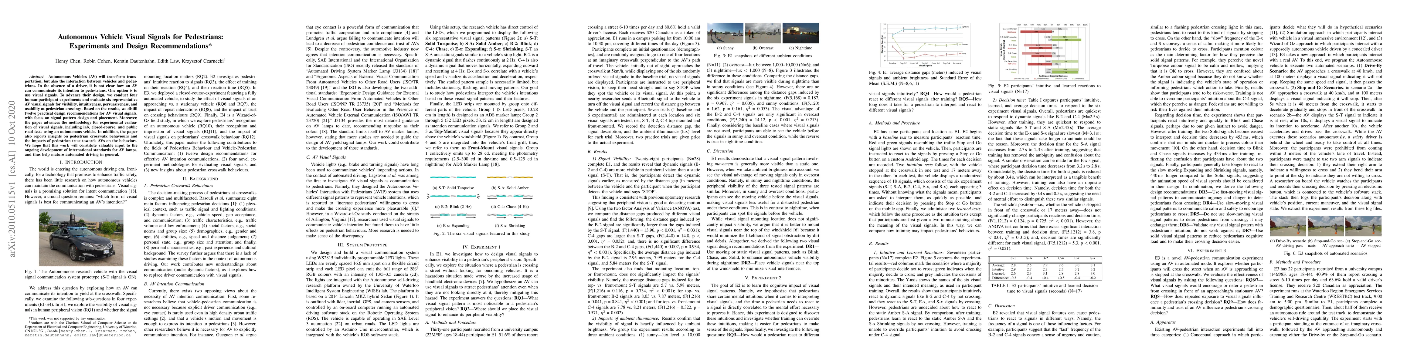 This paper investigates the design of visual signals for autonomous vehicles (AVs) to communicate intentions to pedestrians, conducting experiments to evaluate six visual signals. It proposes twelve design recommendations based on factors like visibility and intuitiveness, and aims to inform international standards for AV lamps to enhance automated driving maturity.