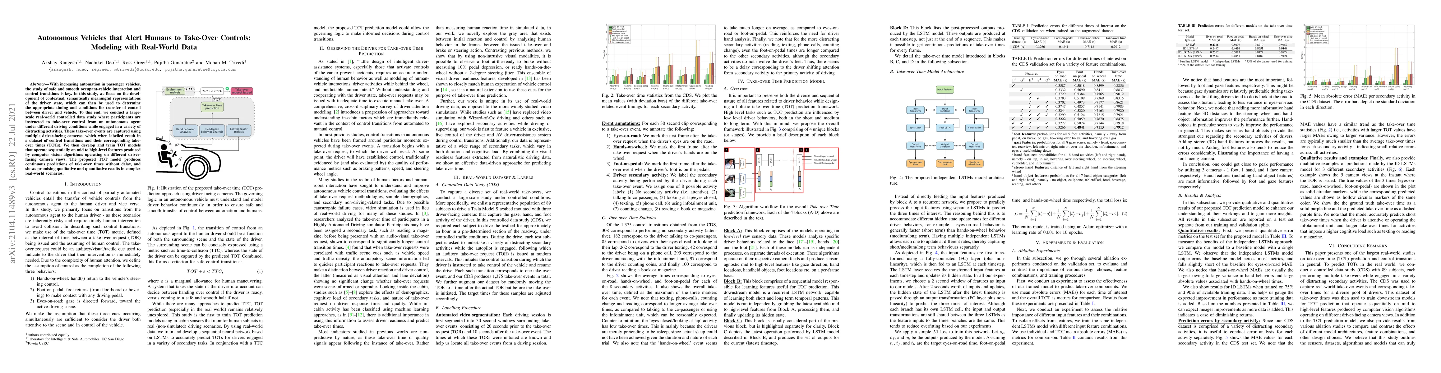 This paper investigates the development of models to predict when drivers should take over control from autonomous vehicles, using real-world data from controlled experiments. The study captures driver-facing camera data during take-over events, trains models to predict take-over times, and demonstrates promising results in complex real-world scenarios.