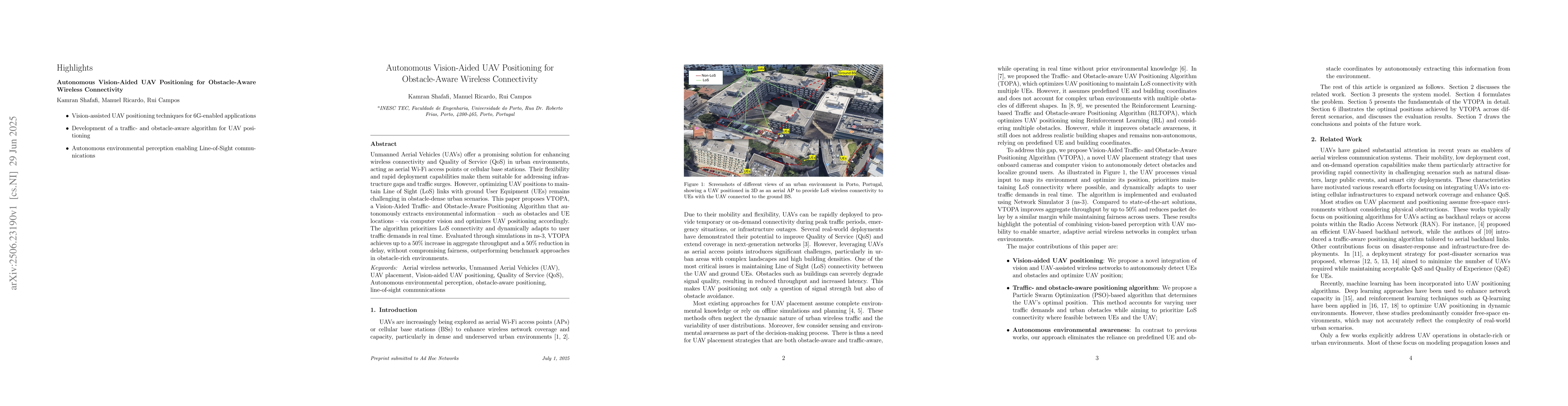 Unmanned Aerial Vehicles (UAVs) offer a promising solution for enhancing wireless connectivity and Quality of Service (QoS) in urban environments, acting as aerial Wi-Fi access points or cellular base stations. Their flexibility and rapid deployment capabilities make them suitable for addressing infrastructure gaps and traffic surges. However, optimizing UAV positions to maintain Line of Sight (LoS) links with ground User Equipment (UEs) remains challenging in obstacle-dense urban scenarios. This paper proposes VTOPA, a Vision-Aided Traffic- and Obstacle-Aware Positioning Algorithm that autonomously extracts environmental information -- such as obstacles and UE locations -- via computer vision and optimizes UAV positioning accordingly. The algorithm prioritizes LoS connectivity and dynamically adapts to user traffic demands in real time. Evaluated through simulations in ns-3, VTOPA achieves up to a 50% increase in aggregate throughput and a 50% reduction in delay, without compromising fairness, outperforming benchmark approaches in obstacle-rich environments.