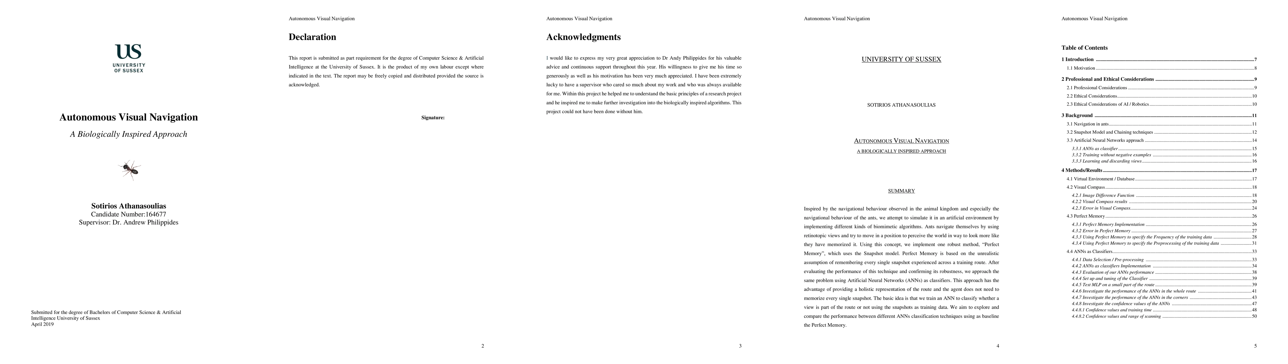 Summary: This paper explores biologically inspired biomimetic algorithms to simulate ant-like navigational behavior in autonomous visual navigation, aiming to replicate the navigational strategies observed in the animal kingdom within an artificial environment.