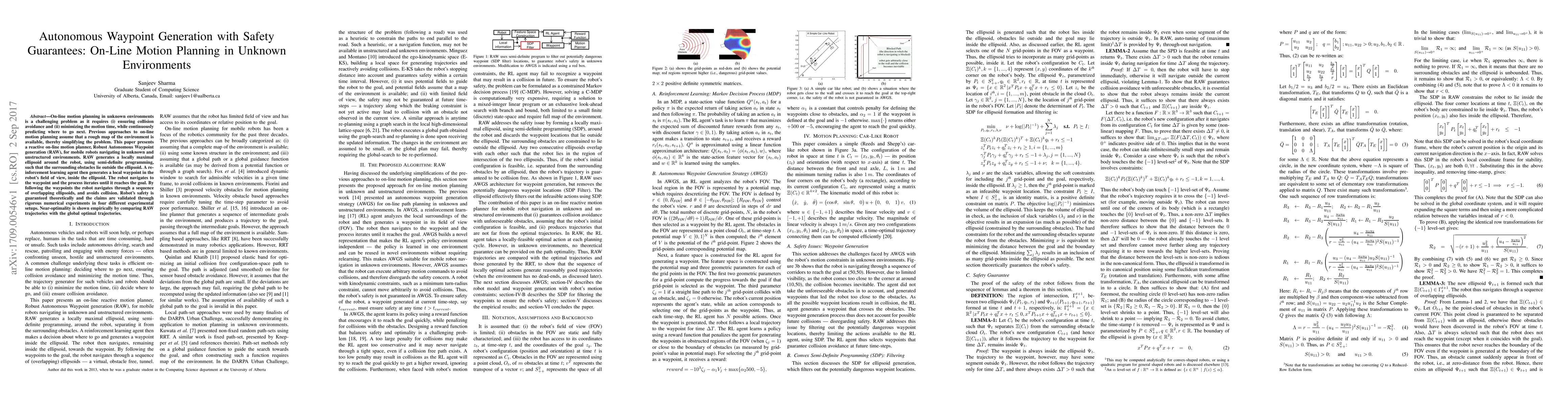 On-line motion planning in unknown environments is a challenging problem as it requires (i) ensuring collision avoidance and (ii) minimizing the motion time, while continuously predicting where to go next. Previous approaches to on-line motion planning assume that a rough map of the environment is available, thereby simplifying the problem. This paper presents a reactive on-line motion planner, Robust Autonomous Waypoint generation (RAW), for mobile robots navigating in unknown and unstructured environments. RAW generates a locally maximal ellipsoid around the robot, using semi-definite programming, such that the surrounding obstacles lie outside the ellipsoid. A reinforcement learning agent then generates a local waypoint in the robot's field of view, inside the ellipsoid. The robot navigates to the waypoint and the process iterates until it reaches the goal. By following the waypoints the robot navigates through a sequence of overlapping ellipsoids, and avoids collision. Robot's safety is guaranteed theoretically and the claims are validated through rigorous numerical experiments in four different experimental setups. Near-optimality is shown empirically by comparing RAW trajectories with the global optimal trajectories.