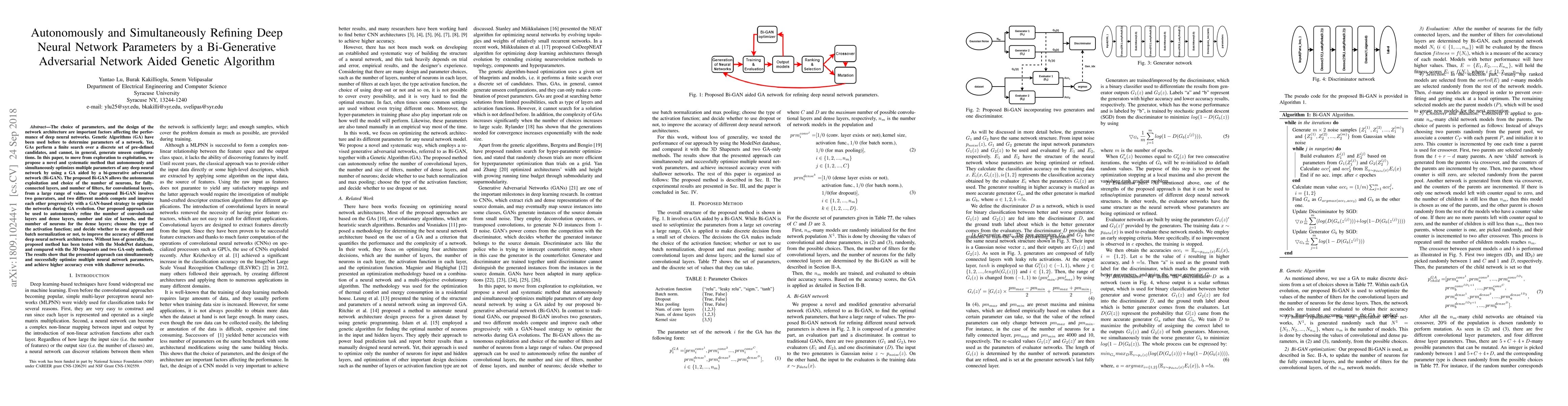 The choice of parameters, and the design of the network architecture are important factors affecting the performance of deep neural networks. Genetic Algorithms (GA) have been used before to determine parameters of a network. Yet, GAs perform a finite search over a discrete set of pre-defined candidates, and cannot, in general, generate unseen configurations. In this paper, to move from exploration to exploitation, we propose a novel and systematic method that autonomously and simultaneously optimizes multiple parameters of any deep neural network by using a GA aided by a bi-generative adversarial network (Bi-GAN). The proposed Bi-GAN allows the autonomous exploitation and choice of the number of neurons, for fully-connected layers, and number of filters, for convolutional layers, from a large range of values. Our proposed Bi-GAN involves two generators, and two different models compete and improve each other progressively with a GAN-based strategy to optimize the networks during GA evolution. Our proposed approach can be used to autonomously refine the number of convolutional layers and dense layers, number and size of kernels, and the number of neurons for the dense layers; choose the type of the activation function; and decide whether to use dropout and batch normalization or not, to improve the accuracy of different deep neural network architectures. Without loss of generality, the proposed method has been tested with the ModelNet database, and compared with the 3D Shapenets and two GA-only methods. The results show that the presented approach can simultaneously and successfully optimize multiple neural network parameters, and achieve higher accuracy even with shallower networks.
