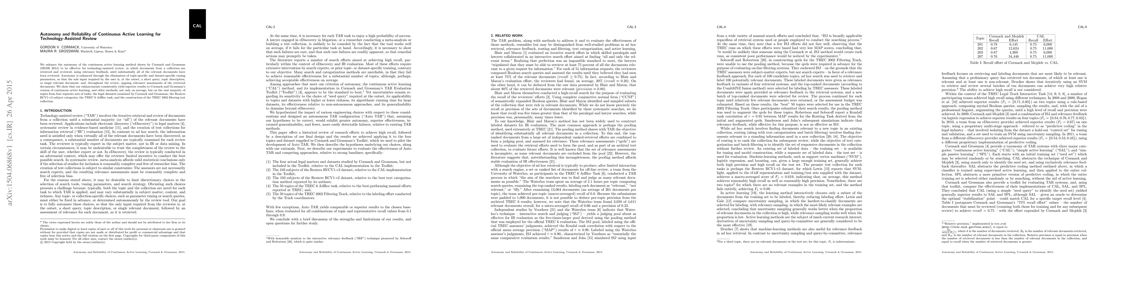 This paper enhances the autonomy of continuous active learning for technology-assisted review by eliminating the need for topic-specific and dataset-specific tuning parameters. The improved method consistently outperforms previous versions and other methods across multiple datasets.