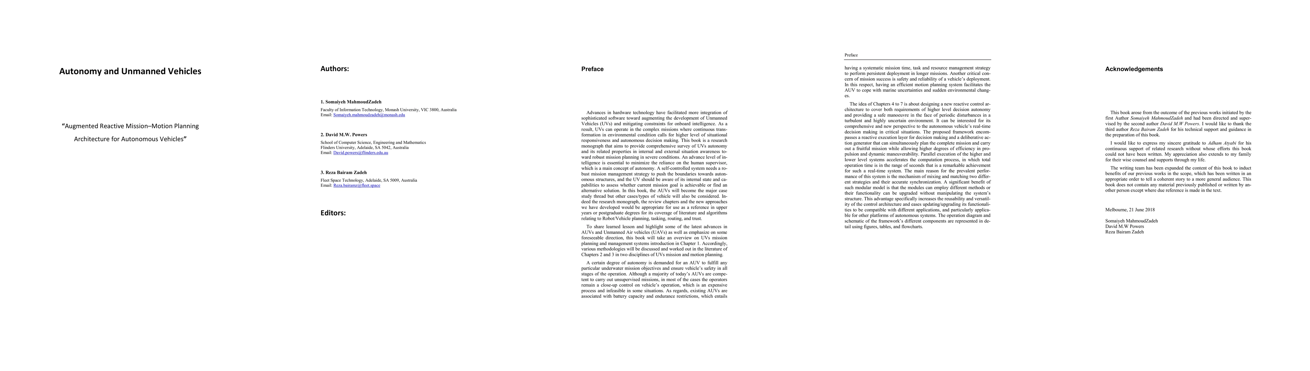 Advances in hardware technology have facilitated more integration of sophisticated software toward augmenting the development of Unmanned Vehicles (UVs) and mitigating constraints for onboard intelligence. As a result, UVs can operate in complex missions where continuous trans-formation in environmental condition calls for a higher level of situational responsiveness and autonomous decision making. This book is a research monograph that aims to provide a comprehensive survey of UVs autonomy and its related properties in internal and external situation awareness to-ward robust mission planning in severe conditions. An advance level of intelligence is essential to minimize the reliance on the human supervisor, which is a main concept of autonomy. A self-controlled system needs a robust mission management strategy to push the boundaries towards autonomous structures, and the UV should be aware of its internal state and capabilities to assess whether current mission goal is achievable or find an alternative solution. In this book, the AUVs will become the major case study thread but other cases/types of vehicle will also be considered. In-deed the research monograph, the review chapters and the new approaches we have developed would be appropriate for use as a reference in upper years or postgraduate degrees for its coverage of literature and algorithms relating to Robot/Vehicle planning, tasking, routing, and trust.