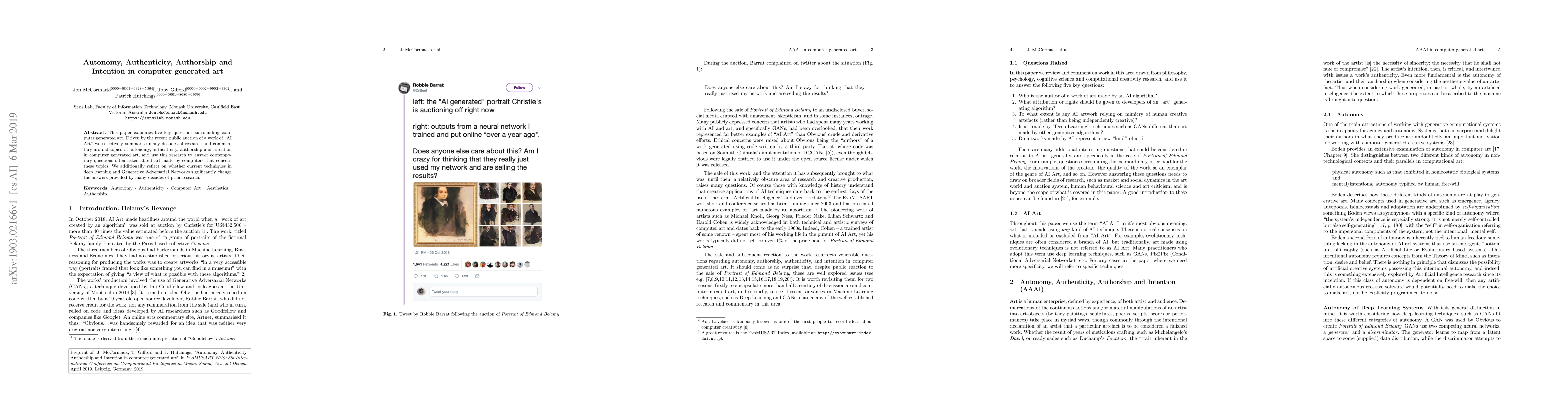 This paper examines five key questions surrounding computer generated art. Driven by the recent public auction of a work of `AI Art' we selectively summarise many decades of research and commentary around topics of autonomy, authenticity, authorship and intention in computer generated art, and use this research to answer contemporary questions often asked about art made by computers that concern these topics. We additionally reflect on whether current techniques in deep learning and Generative Adversarial Networks significantly change the answers provided by many decades of prior research.