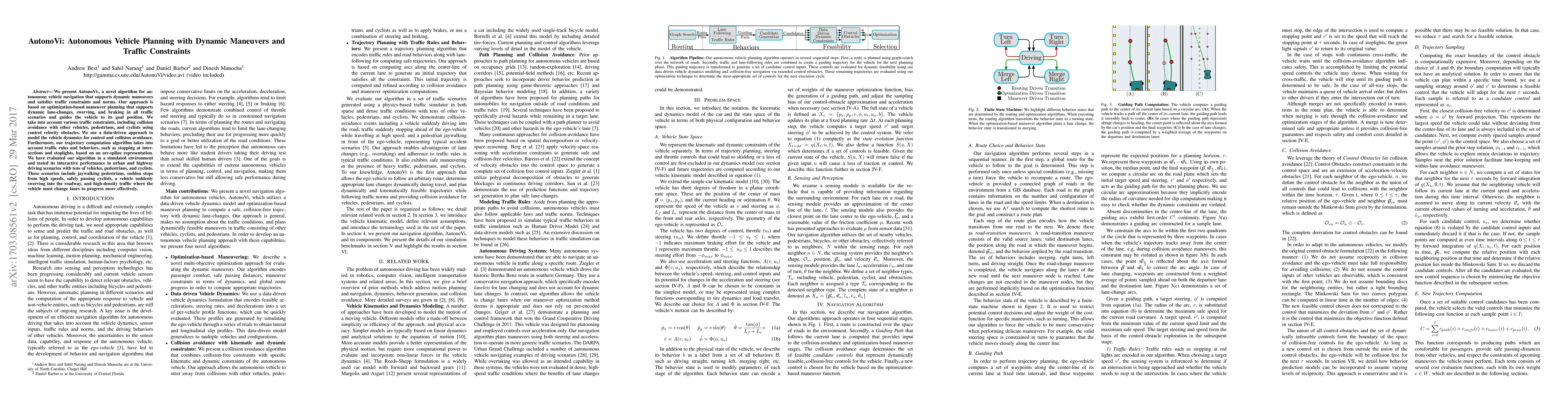 AutonoVi is an optimization-based algorithm for autonomous vehicle navigation, enabling dynamic maneuvers like lane-changes and swerving while adhering to traffic rules and avoiding collisions. It has been tested in complex urban and highway scenarios with mixed traffic.