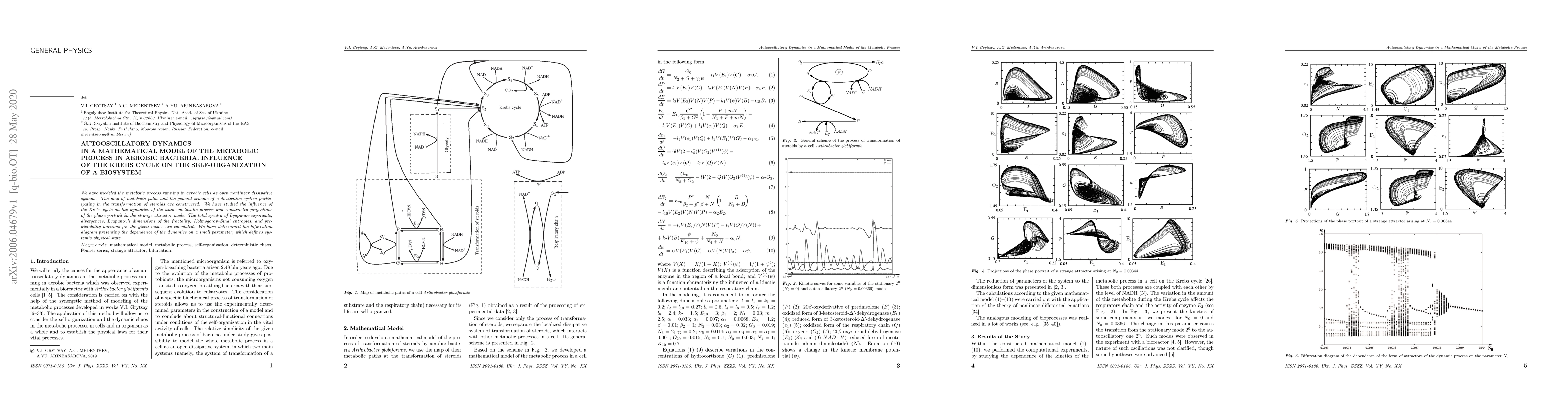 This paper models aerobic bacteria's metabolic processes as open nonlinear dissipative systems, focusing on the influence of the Krebs cycle on the system's self-organization. It analyzes the dynamics using Lyapunov exponents, attractors, and bifurcation diagrams to understand the complex behavior of the metabolic process.