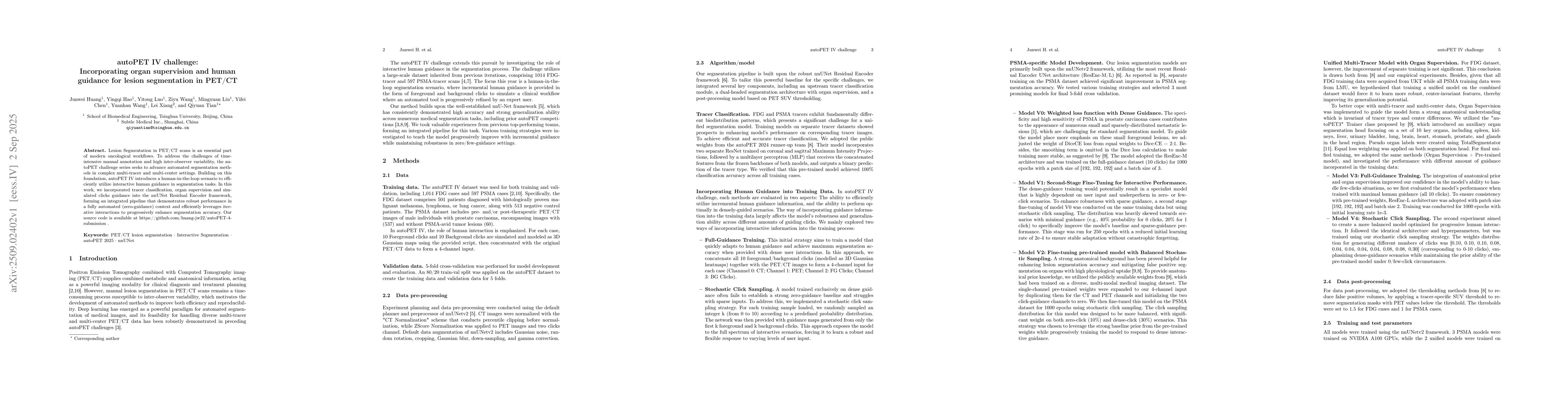 Lesion Segmentation in PET/CT scans is an essential part of modern oncological workflows. To address the challenges of time-intensive manual annotation and high inter-observer variability, the autoPET challenge series seeks to advance automated segmentation methods in complex multi-tracer and multi-center settings. Building on this foundation, autoPET IV introduces a human-in-the-loop scenario to efficiently utilize interactive human guidance in segmentation tasks. In this work, we incorporated tracer classification, organ supervision and simulated clicks guidance into the nnUNet Residual Encoder framework, forming an integrated pipeline that demonstrates robust performance in a fully automated (zero-guidance) context and efficiently leverages iterative interactions to progressively enhance segmentation accuracy.