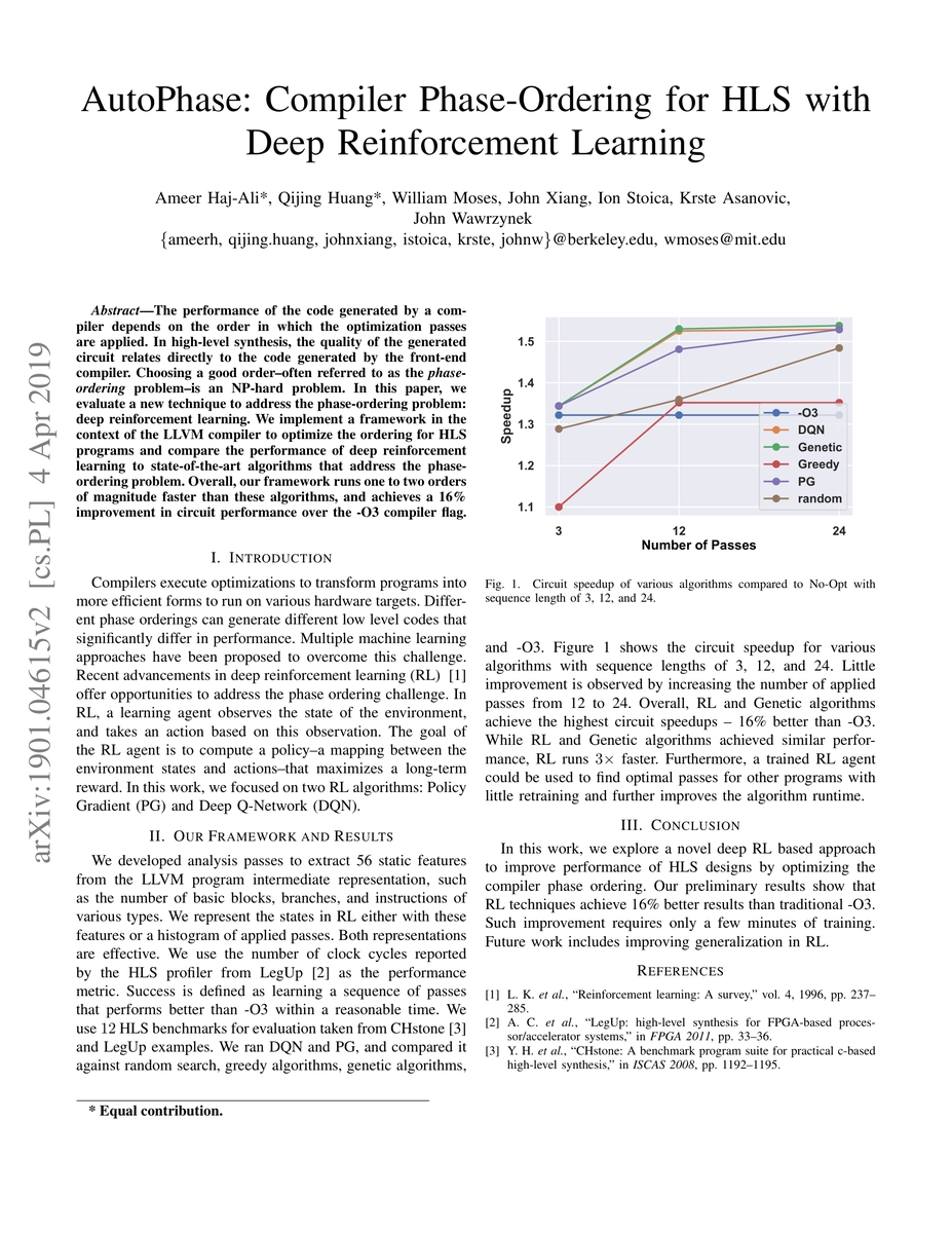 This paper proposes a deep reinforcement learning approach to optimize the phase-ordering problem in high-level synthesis compilers, implemented within the LLVM framework. The method outperforms state-of-the-art algorithms, achieving up to a 16% improvement in circuit performance and significantly faster execution times.