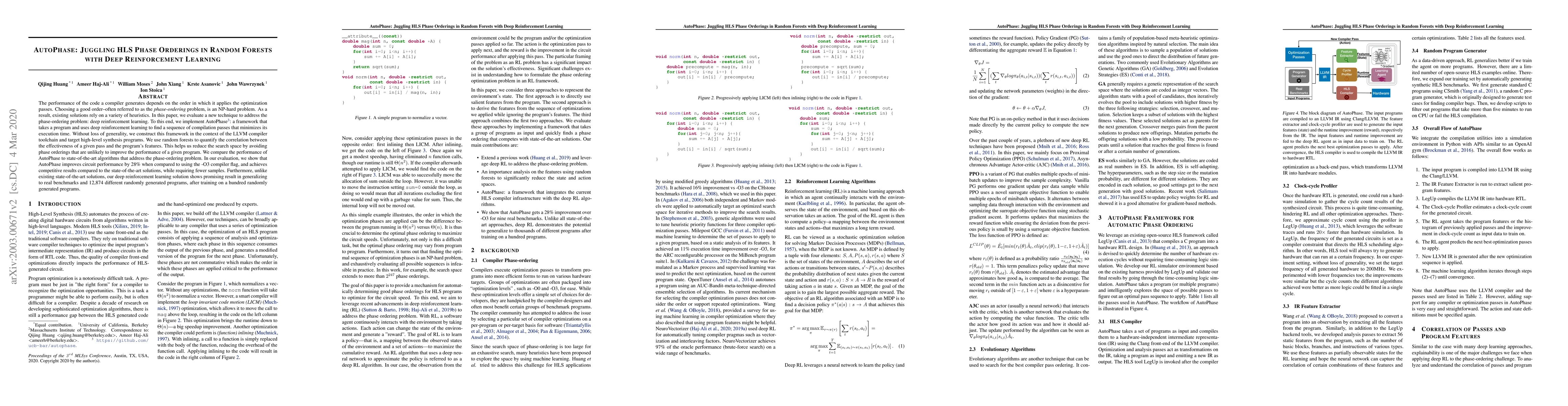 AutoPhase employs deep reinforcement learning to optimize the order of compilation passes in the LLVM toolchain, achieving a 28% improvement in circuit performance compared to the -O3 flag and competitive results with fewer samples. It leverages random forests to reduce the search space and generalizes well to diverse real and randomly generated benchmarks.