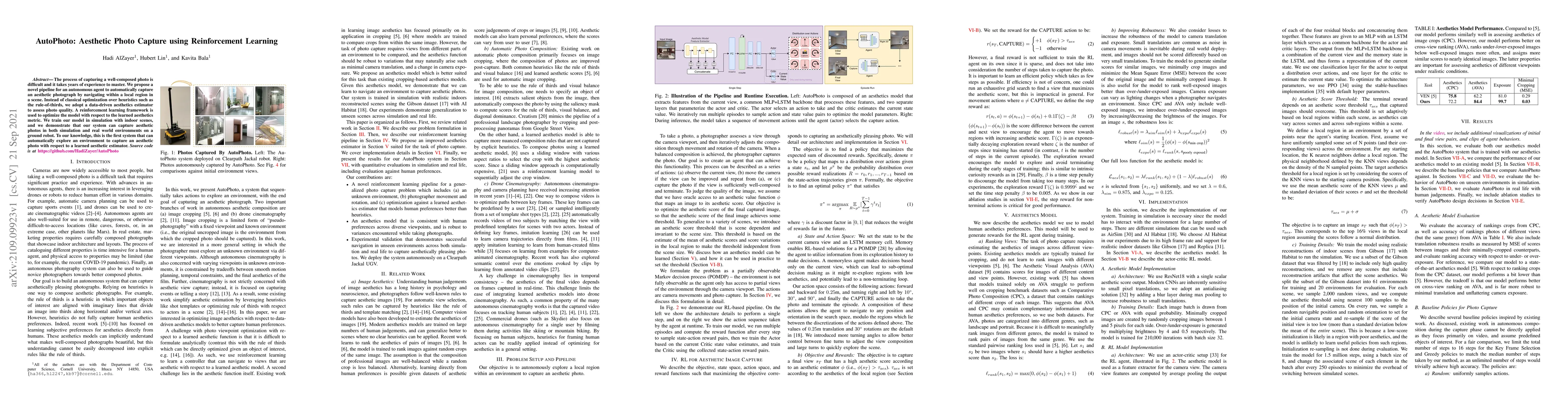 This paper introduces AutoPhoto, a reinforcement learning-based system that autonomously captures aesthetically pleasing photos by navigating and optimizing within a scene. Unlike traditional methods, it uses a data-driven aesthetics estimator and trains in simulation before demonstrating its effectiveness in both simulated and real-world environments.