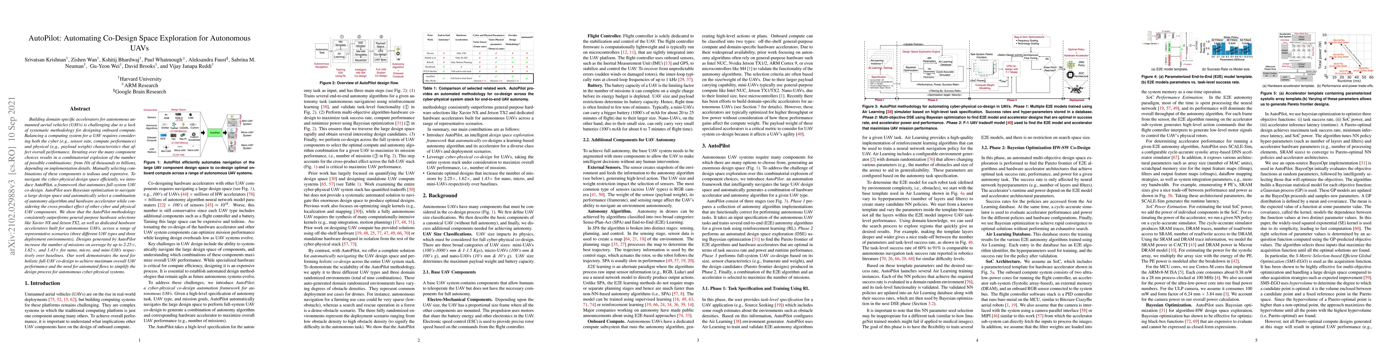 Building domain-specific accelerators for autonomous unmanned aerial vehicles (UAVs) is challenging due to a lack of systematic methodology for designing onboard compute. Balancing a computing system for a UAV requires considering both the cyber (e.g., sensor rate, compute performance) and physical (e.g., payload weight) characteristics that affect overall performance. Iterating over the many component choices results in a combinatorial explosion of the number of possible combinations: from 10s of thousands to billions, depending on implementation details. Manually selecting combinations of these components is tedious and expensive. To navigate the {cyber-physical design space} efficiently, we introduce \emph{AutoPilot}, a framework that automates full-system UAV co-design. AutoPilot uses Bayesian optimization to navigate a large design space and automatically select a combination of autonomy algorithm and hardware accelerator while considering the cross-product effect of other cyber and physical UAV components. We show that the AutoPilot methodology consistently outperforms general-purpose hardware selections like Xavier NX and Jetson TX2, as well as dedicated hardware accelerators built for autonomous UAVs, across a range of representative scenarios (three different UAV types and three deployment environments). Designs generated by AutoPilot increase the number of missions on average by up to 2.25x, 1.62x, and 1.43x for nano, micro, and mini-UAVs respectively over baselines. Our work demonstrates the need for holistic full-UAV co-design to achieve maximum overall UAV performance and the need for automated flows to simplify the design process for autonomous cyber-physical systems.