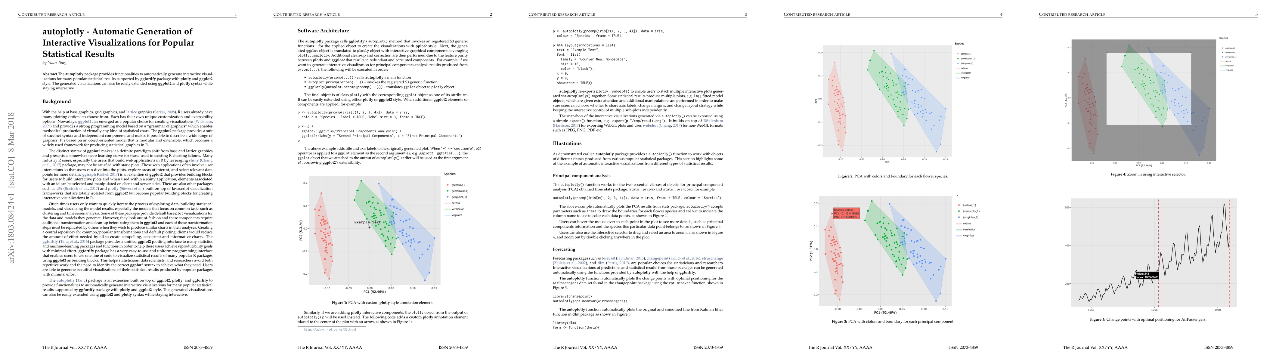 Summary: The autoplotly package automates the creation of interactive visualizations for popular statistical results, leveraging ggfortify, plotly, and ggplot2, and allows for easy customization using ggplot2 and plotly syntax.