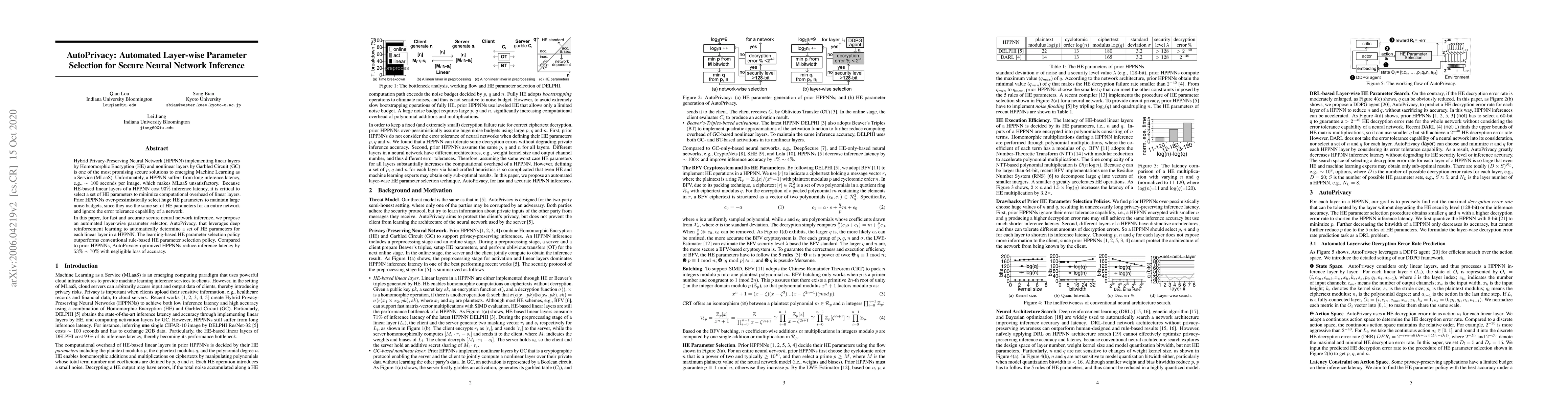 AutoPrivacy introduces an automated method using deep reinforcement learning to optimize Homomorphic Encryption parameters for each layer in a Hybrid Privacy-Preserving Neural Network, significantly reducing inference latency by 53% to 70% while maintaining accuracy.