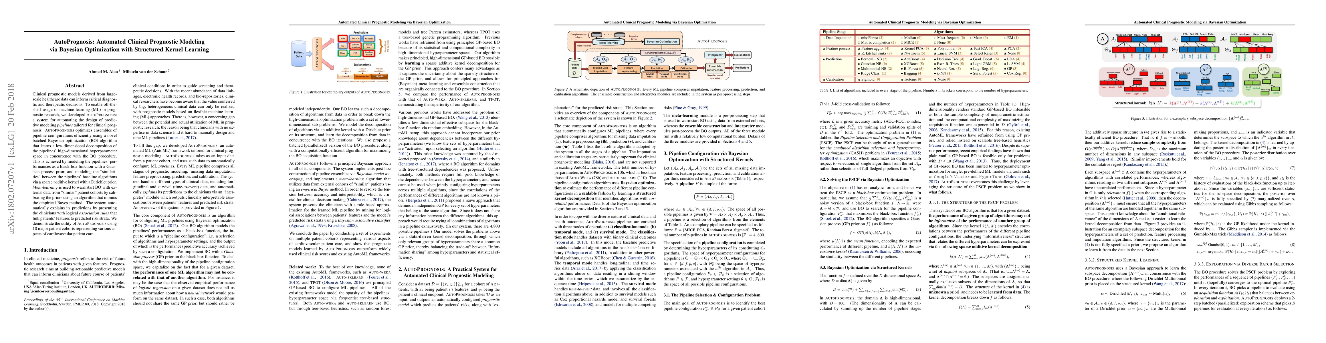 AUTOPROGNOSIS automates the design of clinical prognostic models using Bayesian optimization and structured kernel learning, optimizing predictive pipelines and providing interpretable explanations for clinicians. Demonstrated on 10 diverse cardiovascular cohorts, it enhances machine learning's applicability in healthcare.