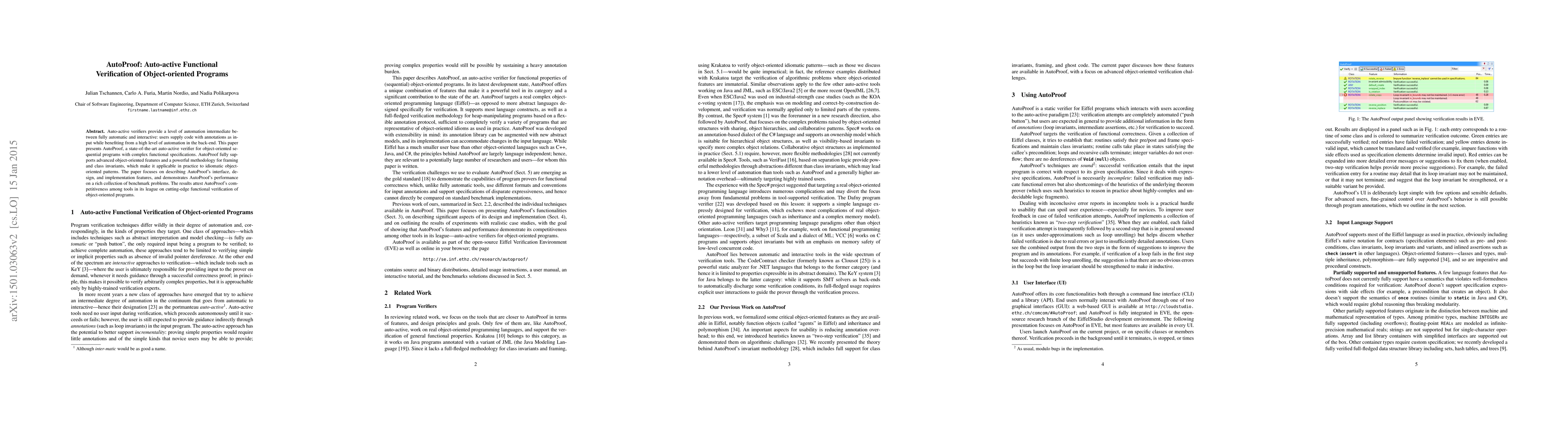 AutoProof is an advanced auto-active verifier for object-oriented programs that automates functional verification while allowing users to provide annotations. It supports complex object-oriented features and is competitive in performance for functional verification tasks.