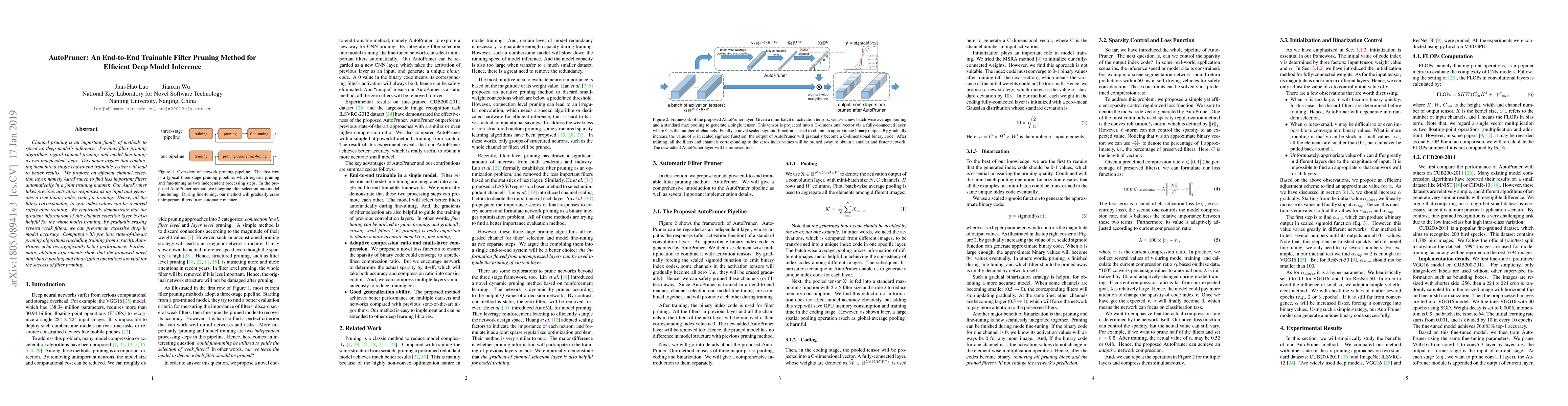 Channel pruning is an important family of methods to speed up deep model's inference. Previous filter pruning algorithms regard channel pruning and model fine-tuning as two independent steps. This paper argues that combining them into a single end-to-end trainable system will lead to better results. We propose an efficient channel selection layer, namely AutoPruner, to find less important filters automatically in a joint training manner. Our AutoPruner takes previous activation responses as an input and generates a true binary index code for pruning. Hence, all the filters corresponding to zero index values can be removed safely after training. We empirically demonstrate that the gradient information of this channel selection layer is also helpful for the whole model training. By gradually erasing several weak filters, we can prevent an excessive drop in model accuracy. Compared with previous state-of-the-art pruning algorithms (including training from scratch), AutoPruner achieves significantly better performance. Furthermore, ablation experiments show that the proposed novel mini-batch pooling and binarization operations are vital for the success of filter pruning.