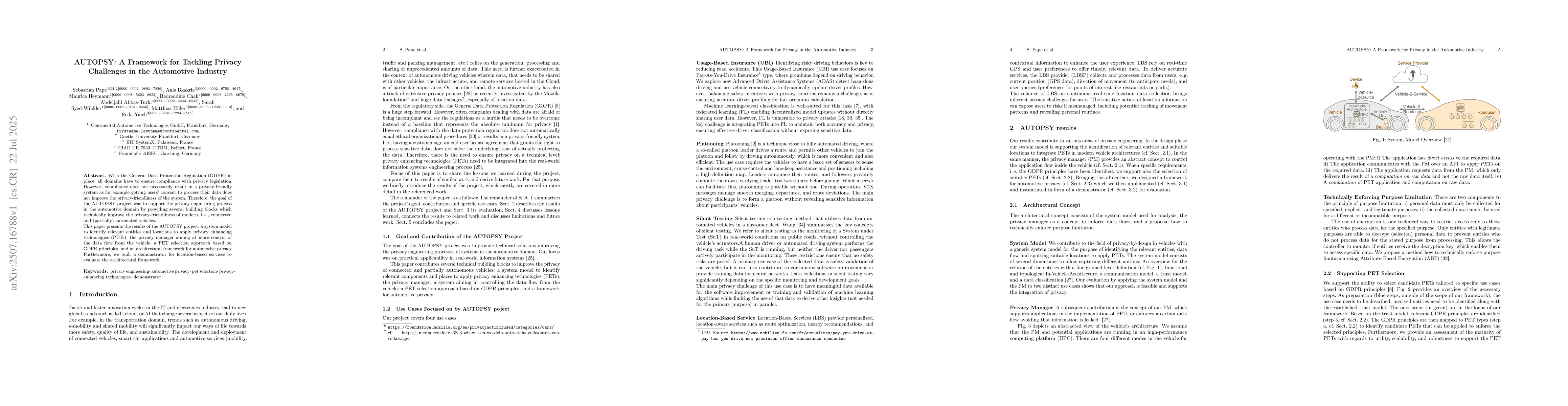 With the General Data Protection Regulation (GDPR) in place, all domains have to ensure compliance with privacy legislation. However, compliance does not necessarily result in a privacy-friendly system as for example getting users' consent to process their data does not improve the privacy-friendliness of the system. Therefore, the goal of the AUTOPSY project was to support the privacy engineering process in the automotive domain by providing several building blocks which technically improve the privacy-friendliness of modern, i.e., connected and (partially) automated vehicles. This paper presents the results of the AUTOPSY project: a system model to identify relevant entities and locations to apply privacy enhancing technologies (PETs); the privacy manager aiming at more control of the data flow from the vehicle, a PET selection approach based on GDPR principles, and an architectural framework for automotive privacy. Furthermore, we built a demonstrator for location-based services to evaluate the architectural framework.