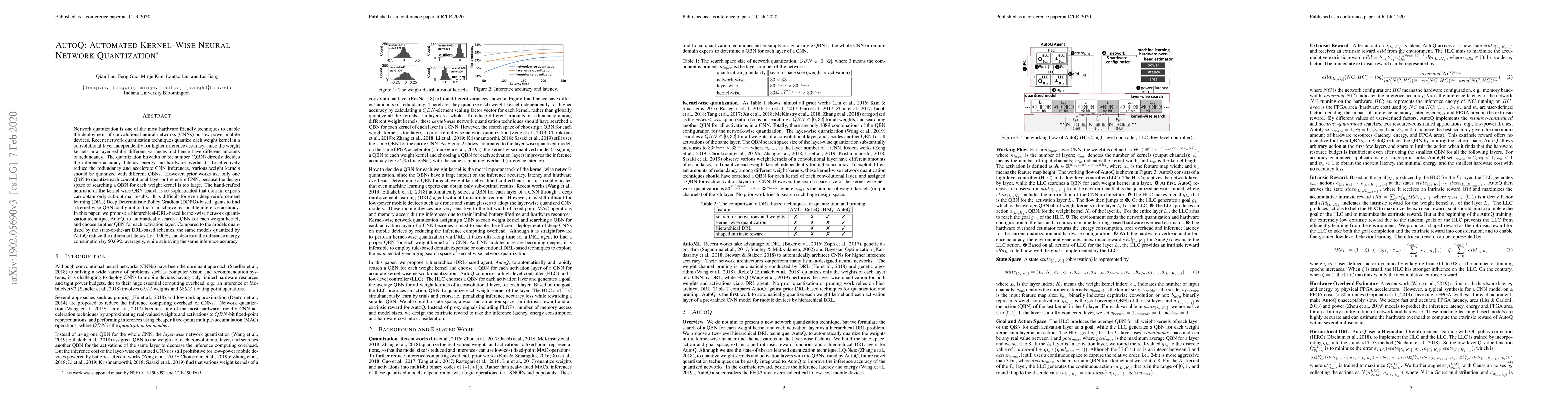 AutoQ introduces a hierarchical-DRL-based approach for automated kernel-wise neural network quantization, optimizing the quantization bit number (QBN) for each weight kernel to enhance inference accuracy and efficiency. This method achieves significant reductions in inference latency and energy consumption compared to state-of-the-art DRL-based techniques, while maintaining equivalent accuracy.