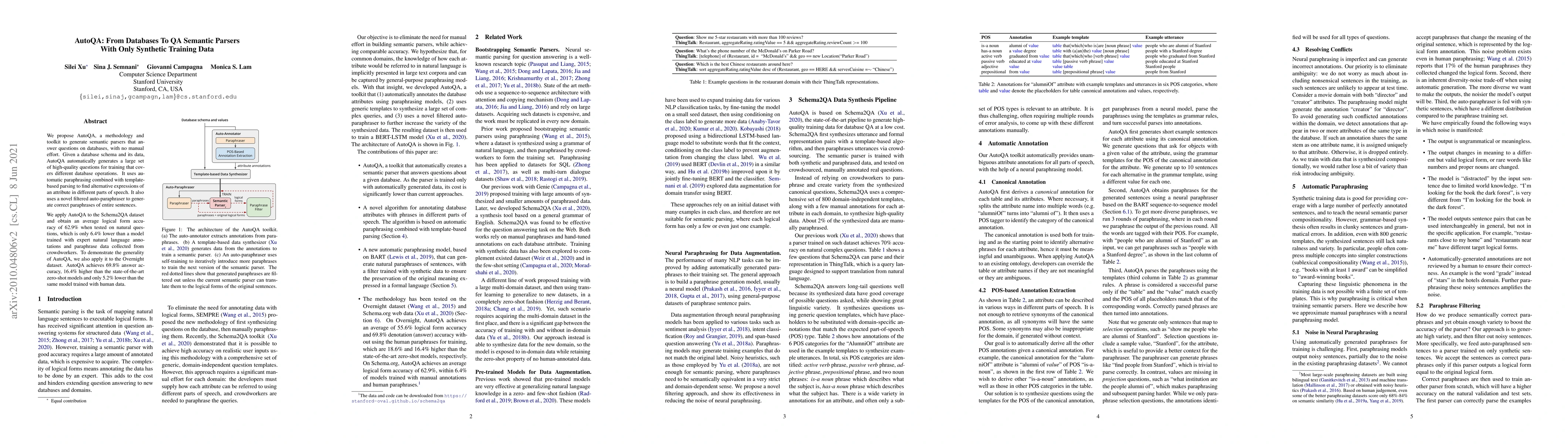 AutoQA is a novel methodology and toolkit that automatically generates semantic parsers for database question answering using only synthetic training data. It achieves competitive performance compared to models trained with human annotations, demonstrating its effectiveness and generality across different datasets.