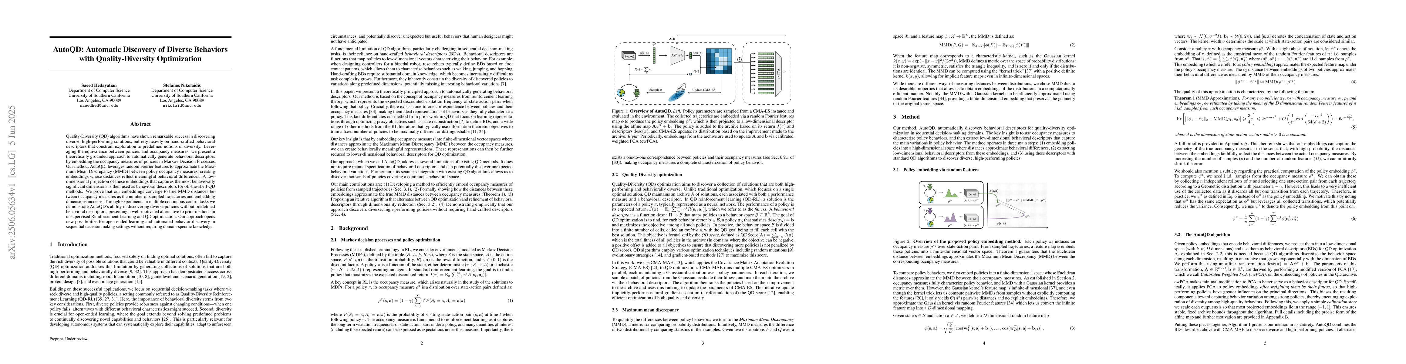 Quality-Diversity (QD) algorithms have shown remarkable success in discovering diverse, high-performing solutions, but rely heavily on hand-crafted behavioral descriptors that constrain exploration to predefined notions of diversity. Leveraging the equivalence between policies and occupancy measures, we present a theoretically grounded approach to automatically generate behavioral descriptors by embedding the occupancy measures of policies in Markov Decision Processes. Our method, AutoQD, leverages random Fourier features to approximate the Maximum Mean Discrepancy (MMD) between policy occupancy measures, creating embeddings whose distances reflect meaningful behavioral differences. A low-dimensional projection of these embeddings that captures the most behaviorally significant dimensions is then used as behavioral descriptors for off-the-shelf QD methods. We prove that our embeddings converge to true MMD distances between occupancy measures as the number of sampled trajectories and embedding dimensions increase. Through experiments in multiple continuous control tasks we demonstrate AutoQD's ability in discovering diverse policies without predefined behavioral descriptors, presenting a well-motivated alternative to prior methods in unsupervised Reinforcement Learning and QD optimization. Our approach opens new possibilities for open-ended learning and automated behavior discovery in sequential decision making settings without requiring domain-specific knowledge.