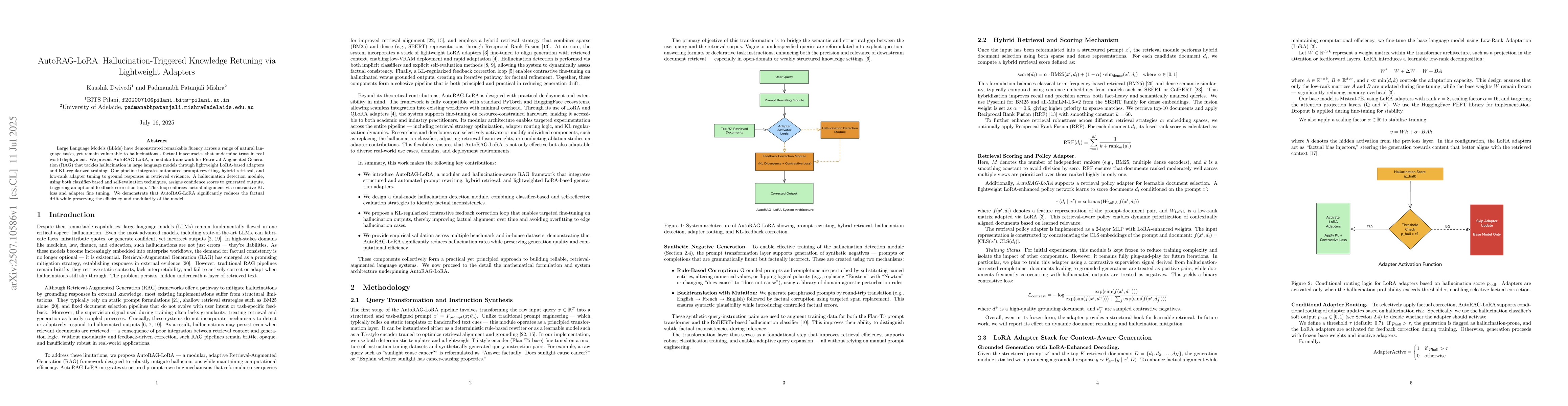 Large Language Models (LLMs) have demonstrated remarkable fluency across a range of natural language tasks, yet remain vulnerable to hallucinations - factual inaccuracies that undermine trust in real world deployment. We present AutoRAG-LoRA, a modular framework for Retrieval-Augmented Generation (RAG) that tackles hallucination in large language models through lightweight LoRA-based adapters and KL-regularized training. Our pipeline integrates automated prompt rewriting, hybrid retrieval, and low-rank adapter tuning to ground responses in retrieved evidence. A hallucination detection module, using both classifier-based and self-evaluation techniques, assigns confidence scores to generated outputs, triggering an optional feedback correction loop. This loop enforces factual alignment via contrastive KL loss and adapter fine tuning. We demonstrate that AutoRAG-LoRA significantly reduces the factual drift while preserving the efficiency and modularity of the model.