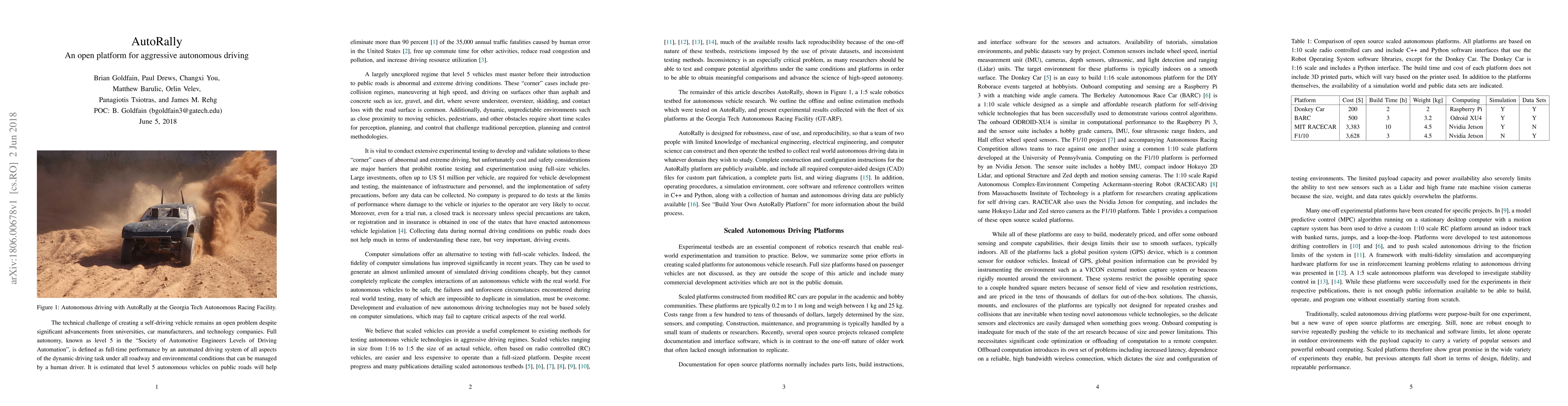 AutoRally is an accessible 1$:$5 scale testbed for autonomous vehicle research, enabling teams to collect real-world driving data. It employs offline algorithms and online state estimation techniques, validated with data from six robots at Georgia Tech.